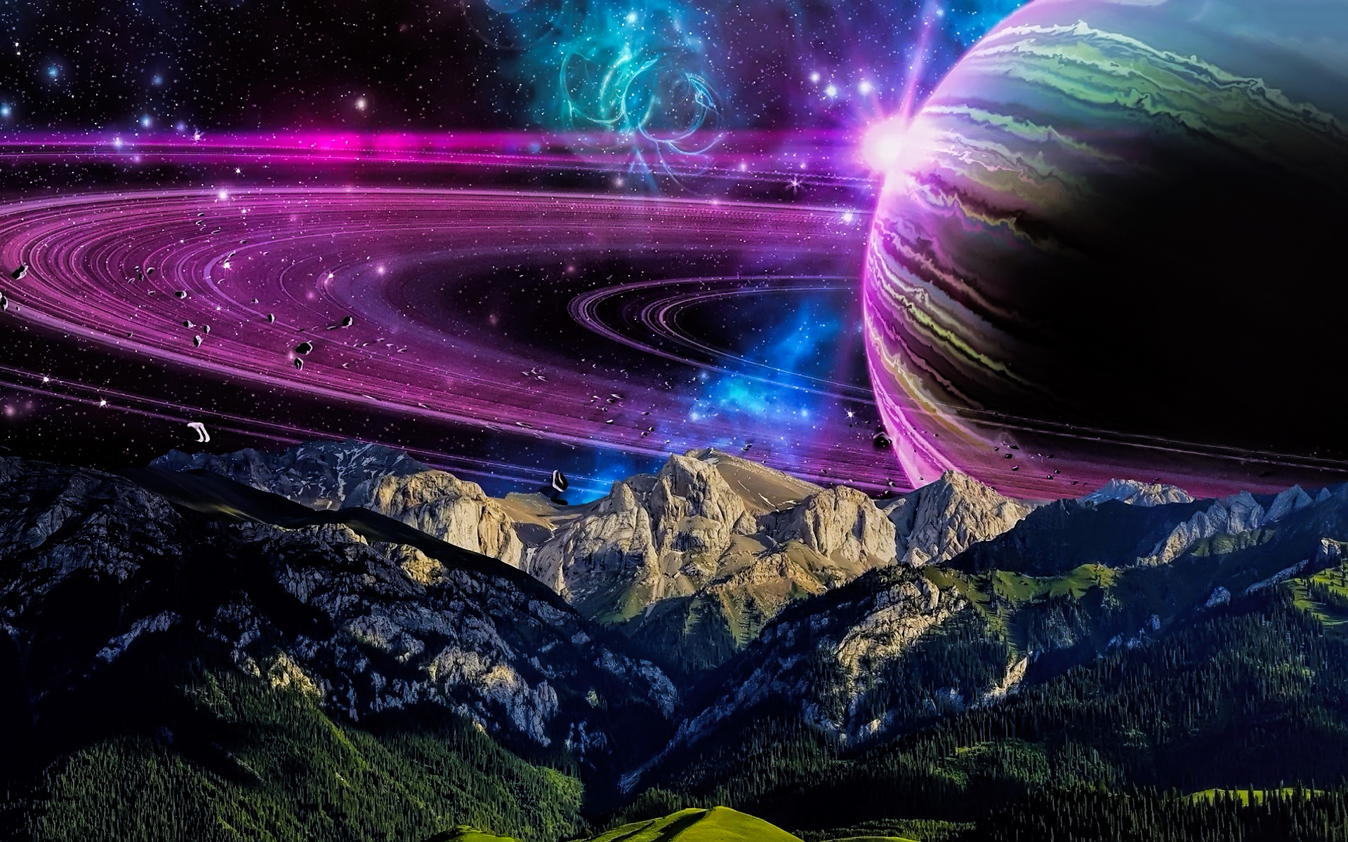 Description: A picture of a planet with mountains and a sky with stars and planets in it and a mountain range in the background.