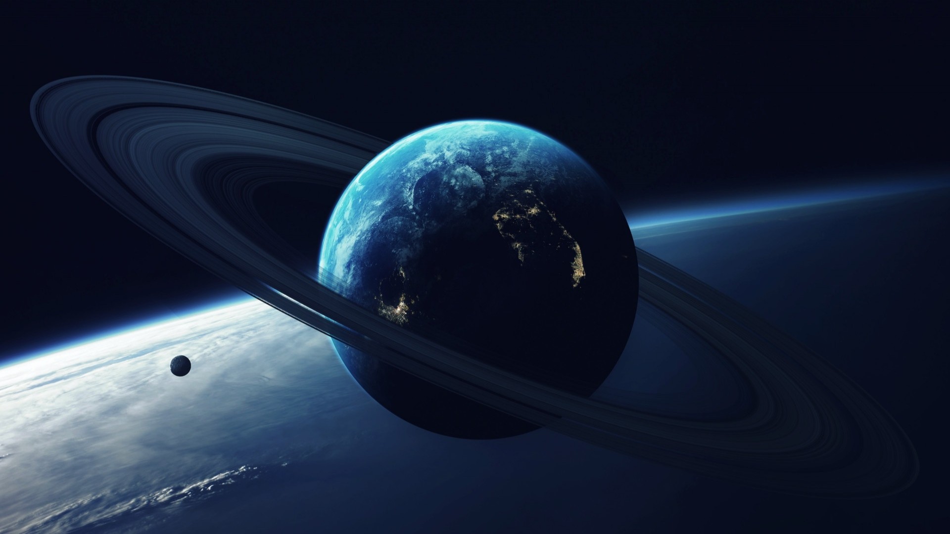 Description: A planet with a ring around it in the sky with a sun in the background and a distant object in the foreground.