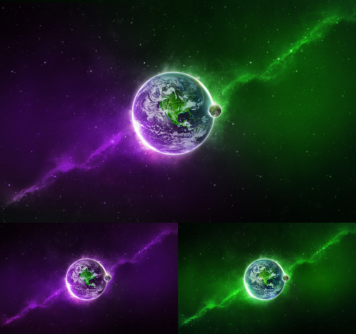 Description: A group of planets in a space with stars and a green and purple background with a green and purple swirl.