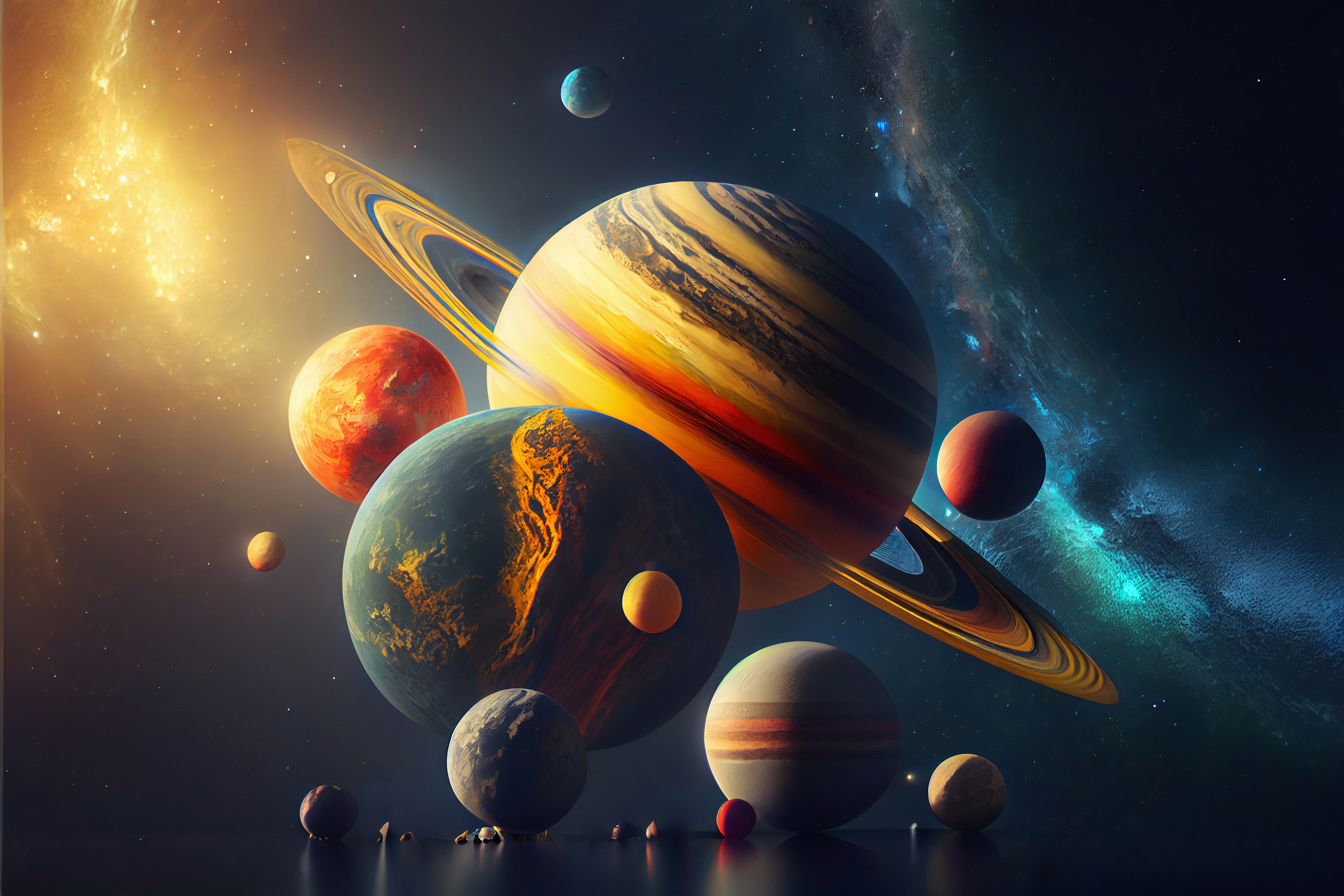 Description: A group of planets in the sky with a bright sun in the background and a reflection of the sun on the ground.
