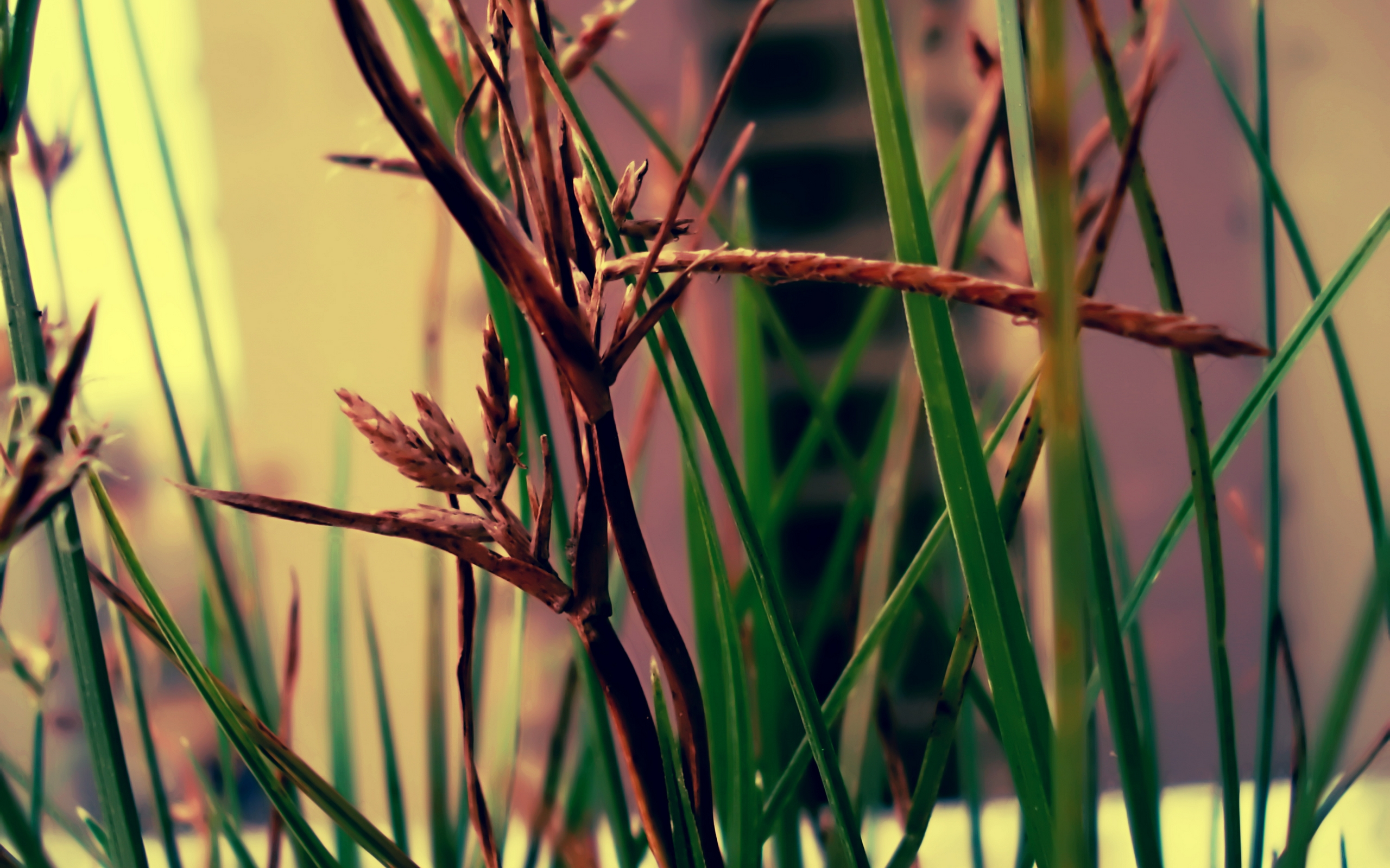 Description: A close up of a plant with long green leaves and brown stems with a building in the background with a window.
