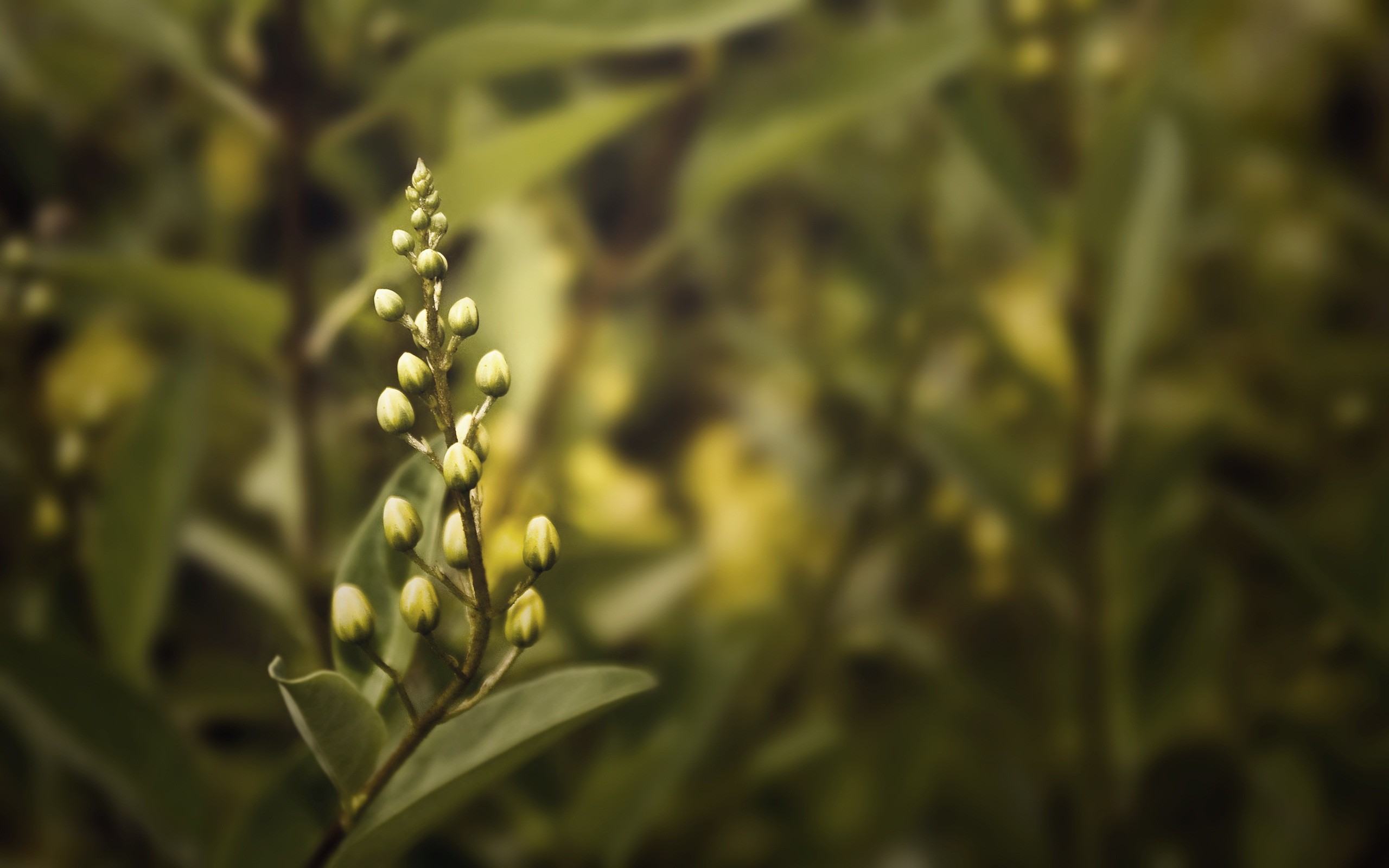 Description: A close up of a plant with flowers in the background of a blurry photo of leaves and branches.