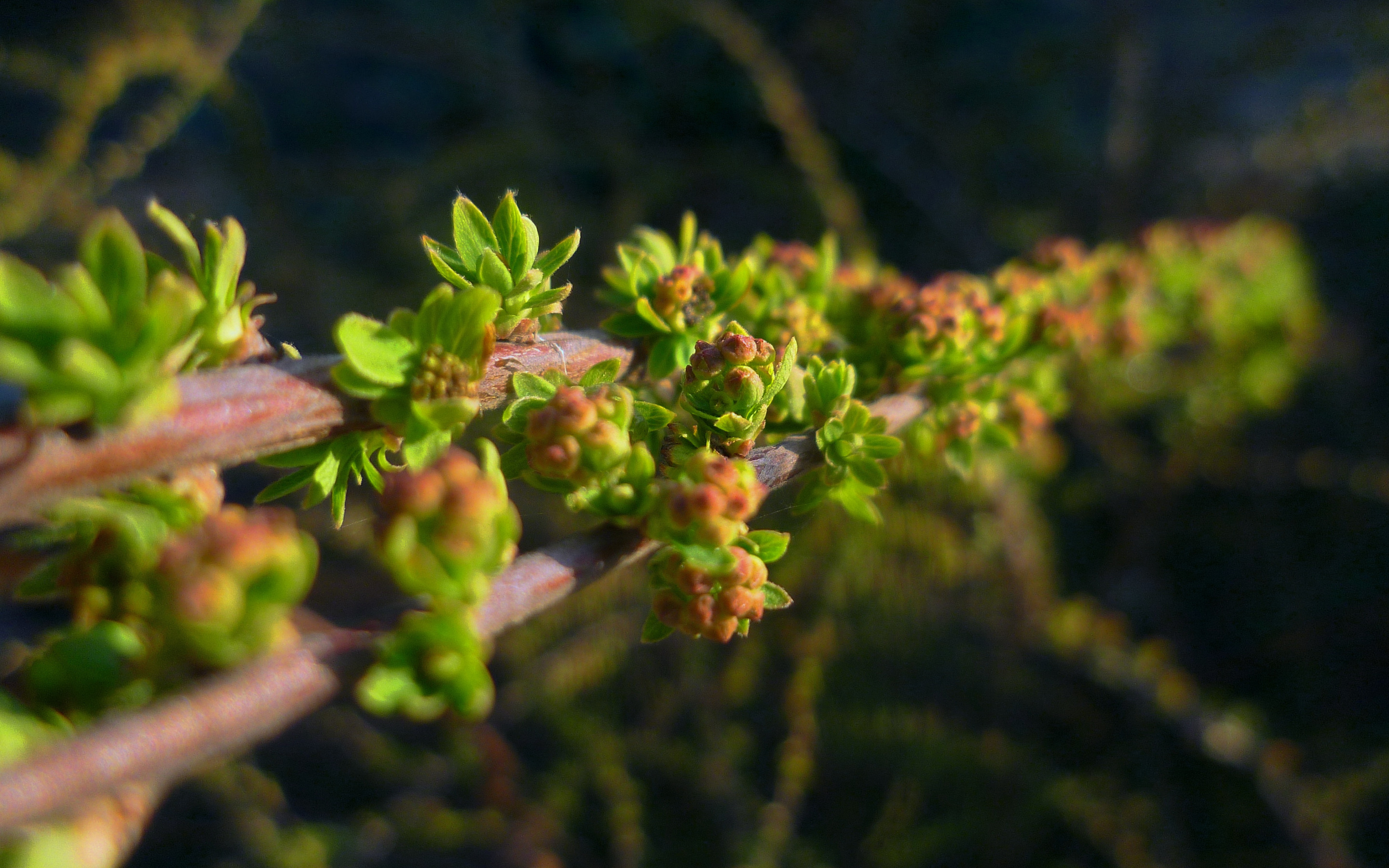 Description: A close up of a plant with small flowers on it's stem and leaves on the stem.