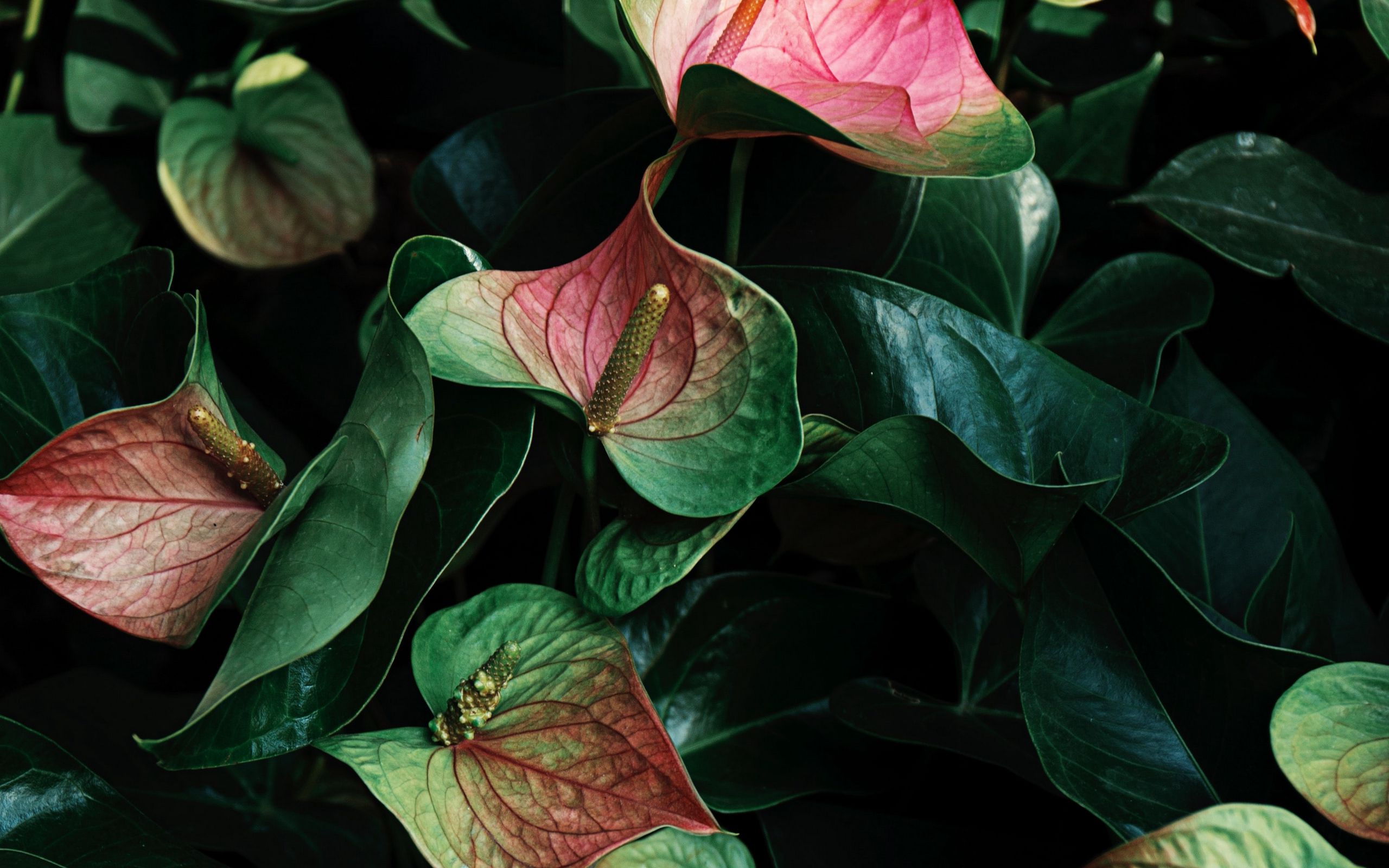 Description: A close up of a plant with red and green leaves on it's leaves and flowers on the plant.