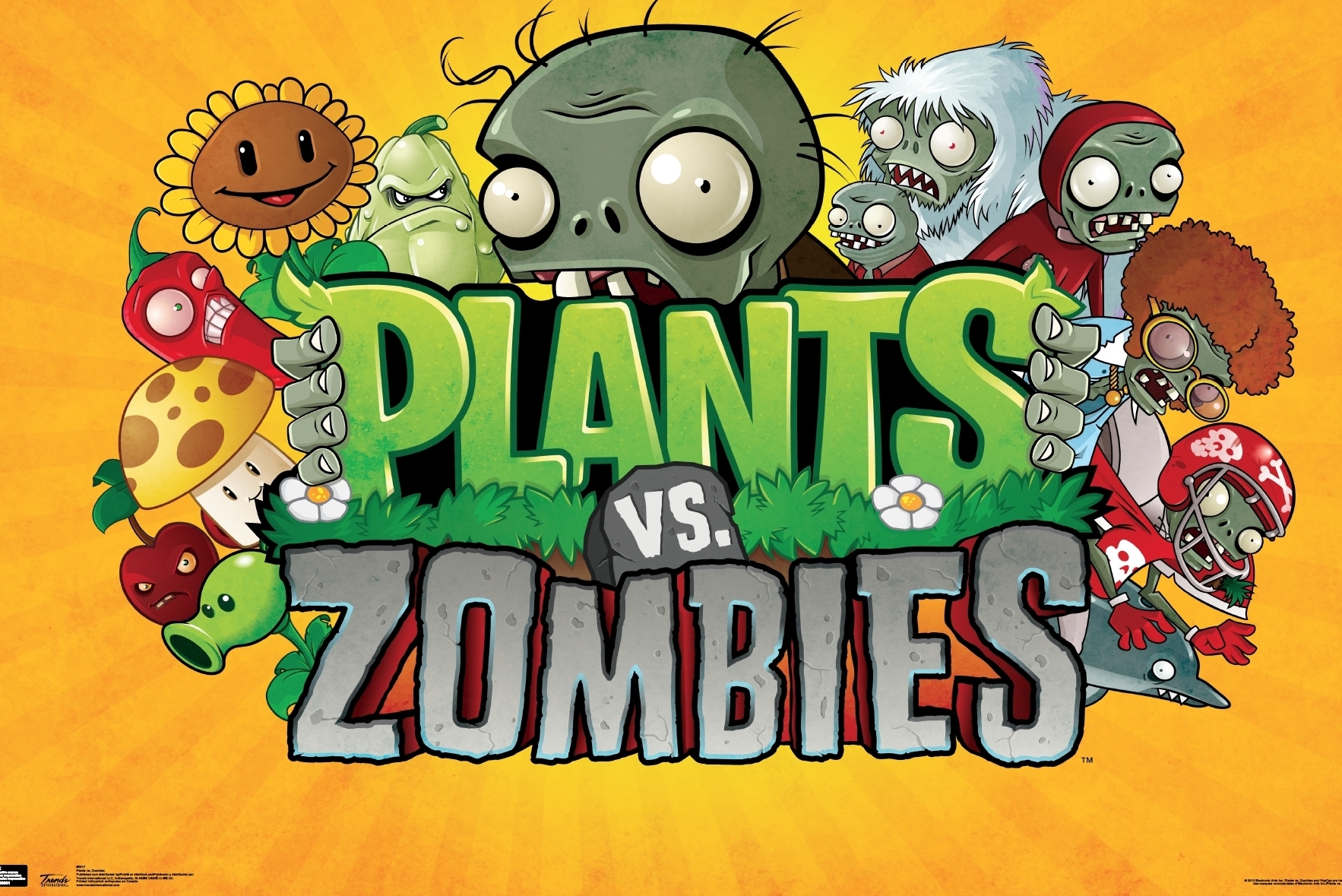 Description: Plants vs zombies logo with zombies and mushrooms in the background of the image.