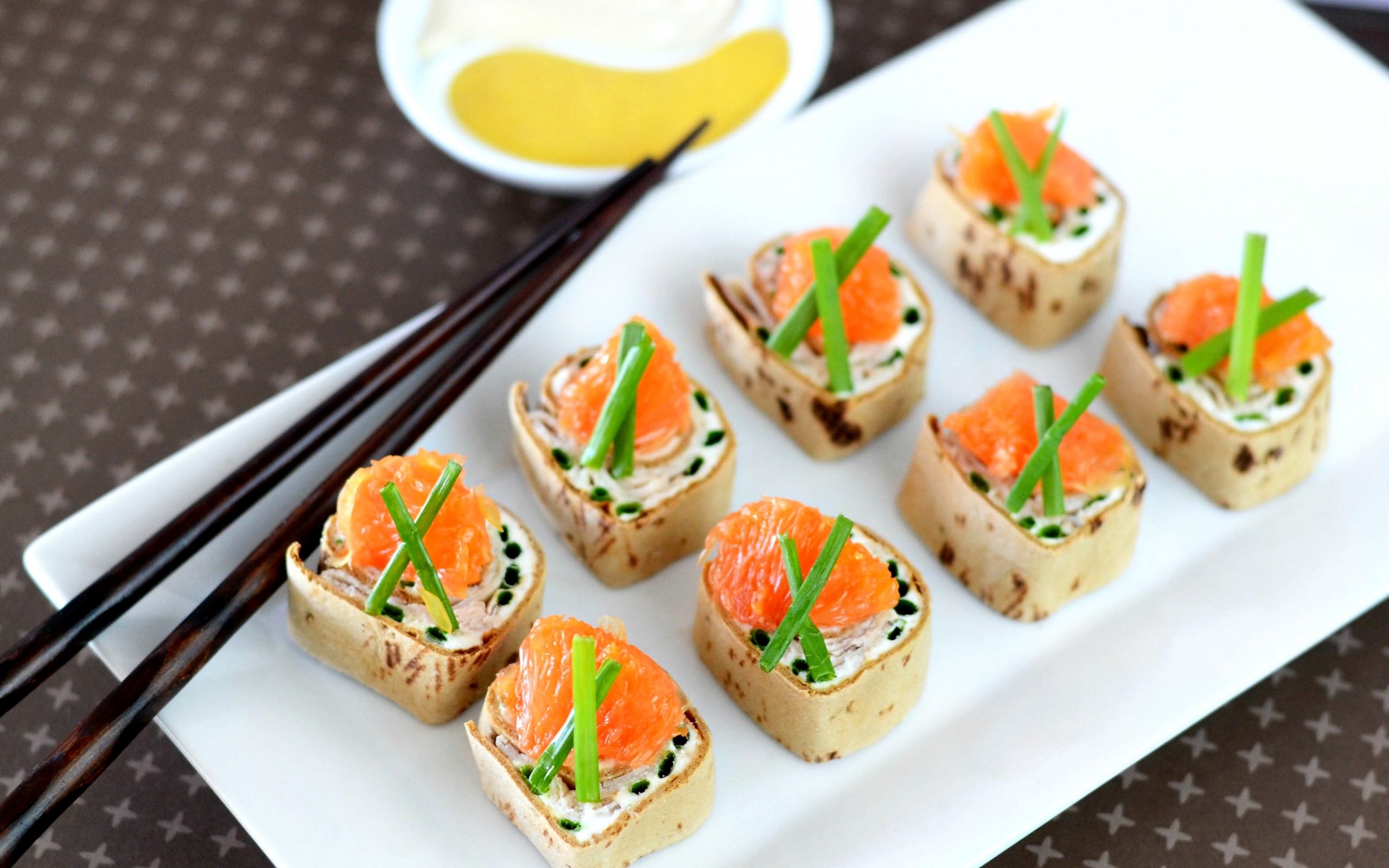 Description: A plate of food with chopsticks and a bowl of sauce in the background with chopsticks.