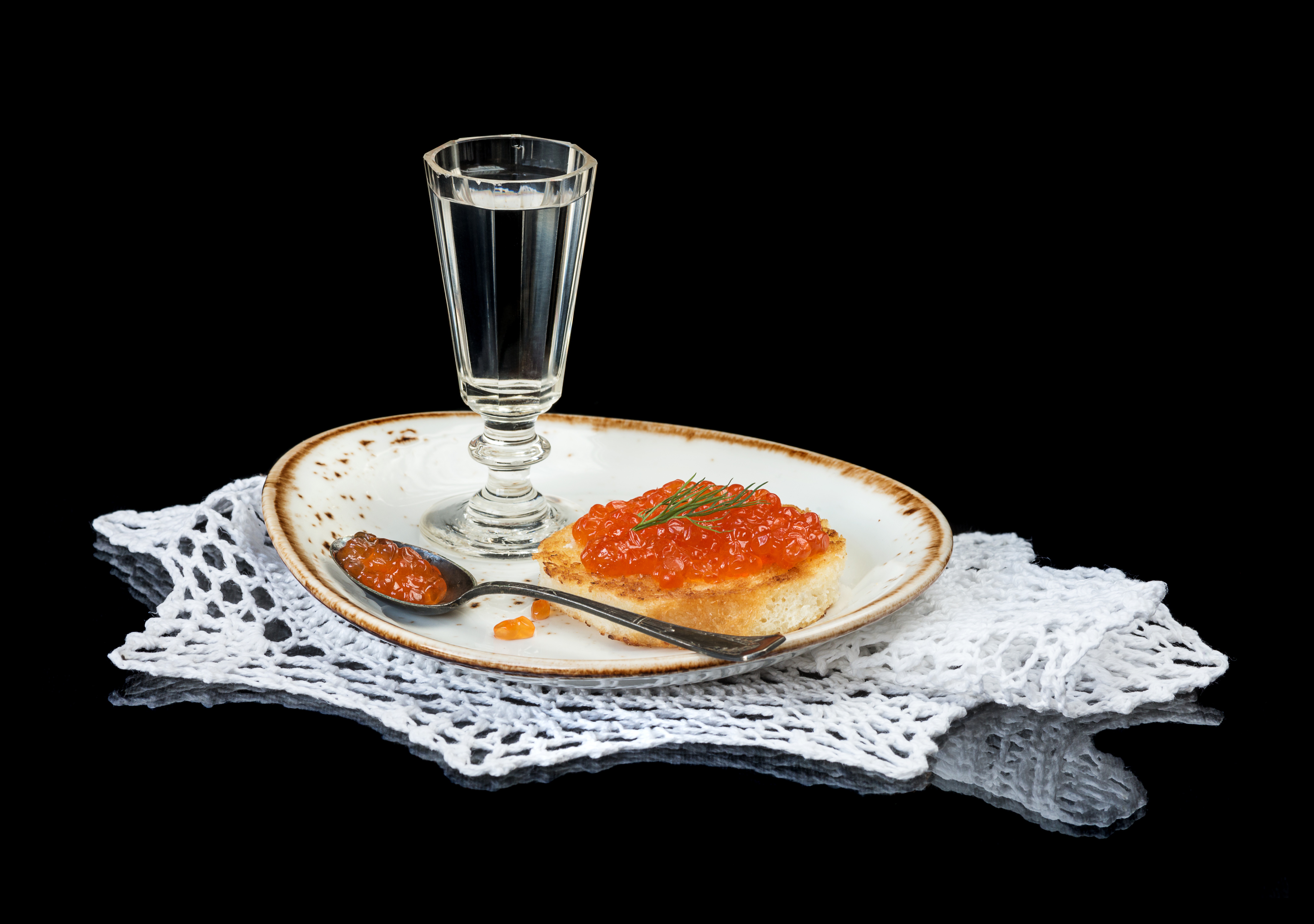 Description: A plate with a fork and a glass of wine on it with a lace doily on the table.