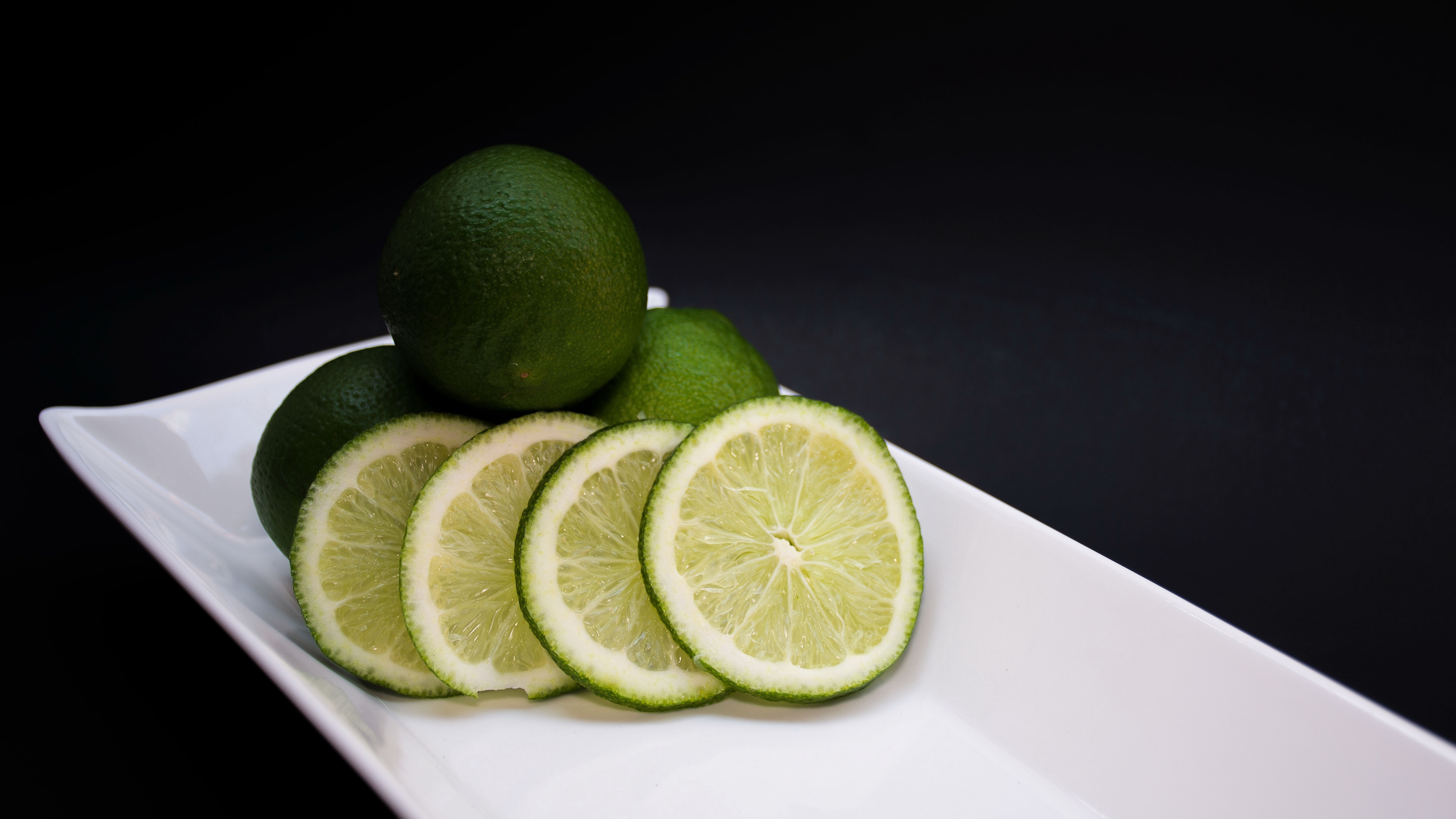 Description: A plate with limes and lime slices on it on a table top with a black background and a black background.
