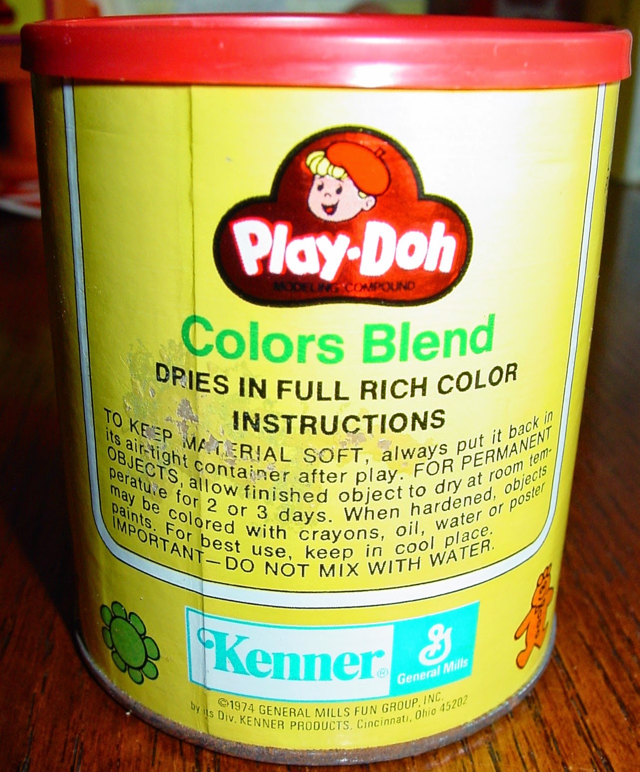 Description: A can of play doh sits on a table with a cup of coffee in the background and a cup of coffee in the foreground.