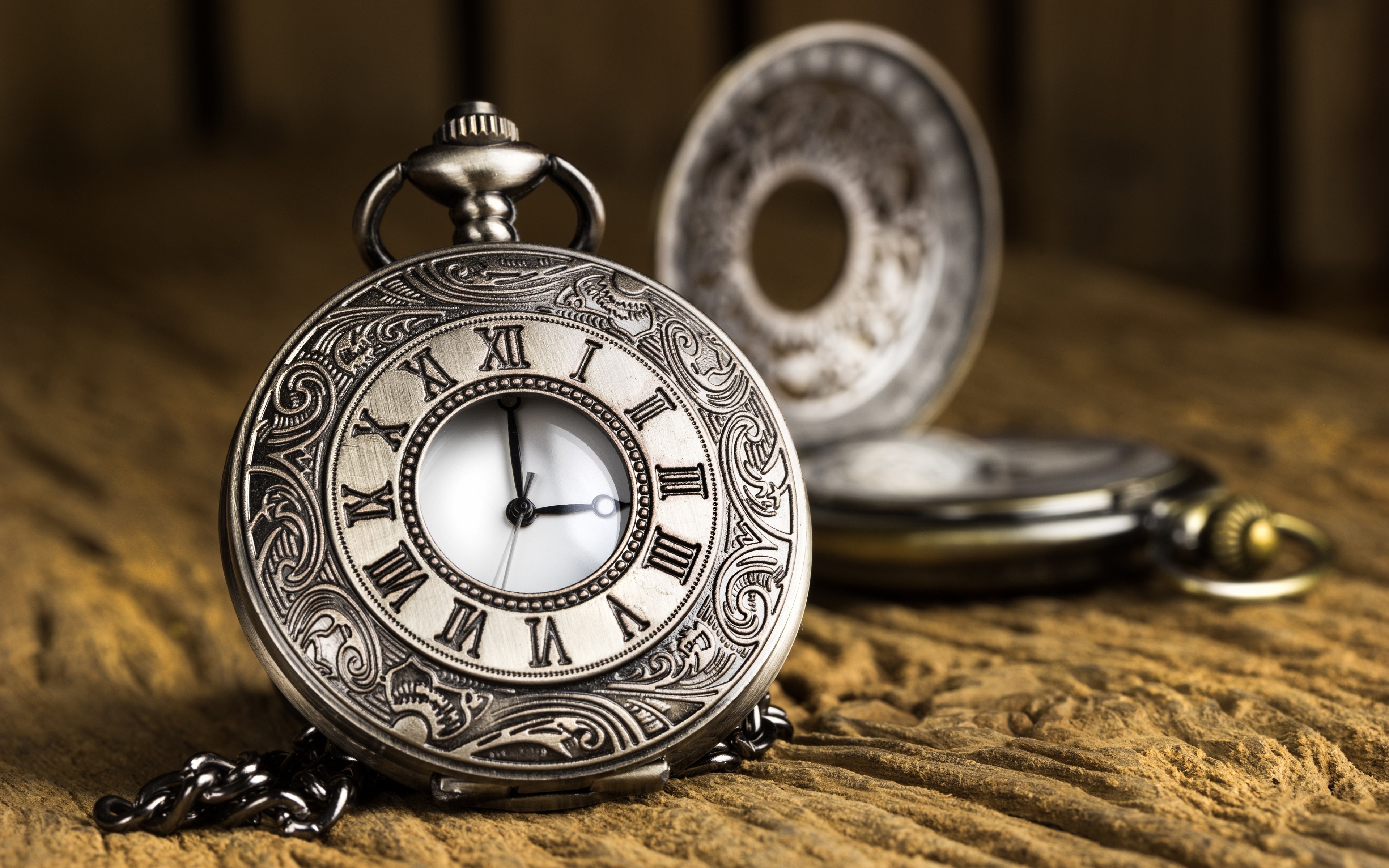 Description: A pocket watch sitting on a bed with a chain around it's neck and a clock on the side of the pocket.