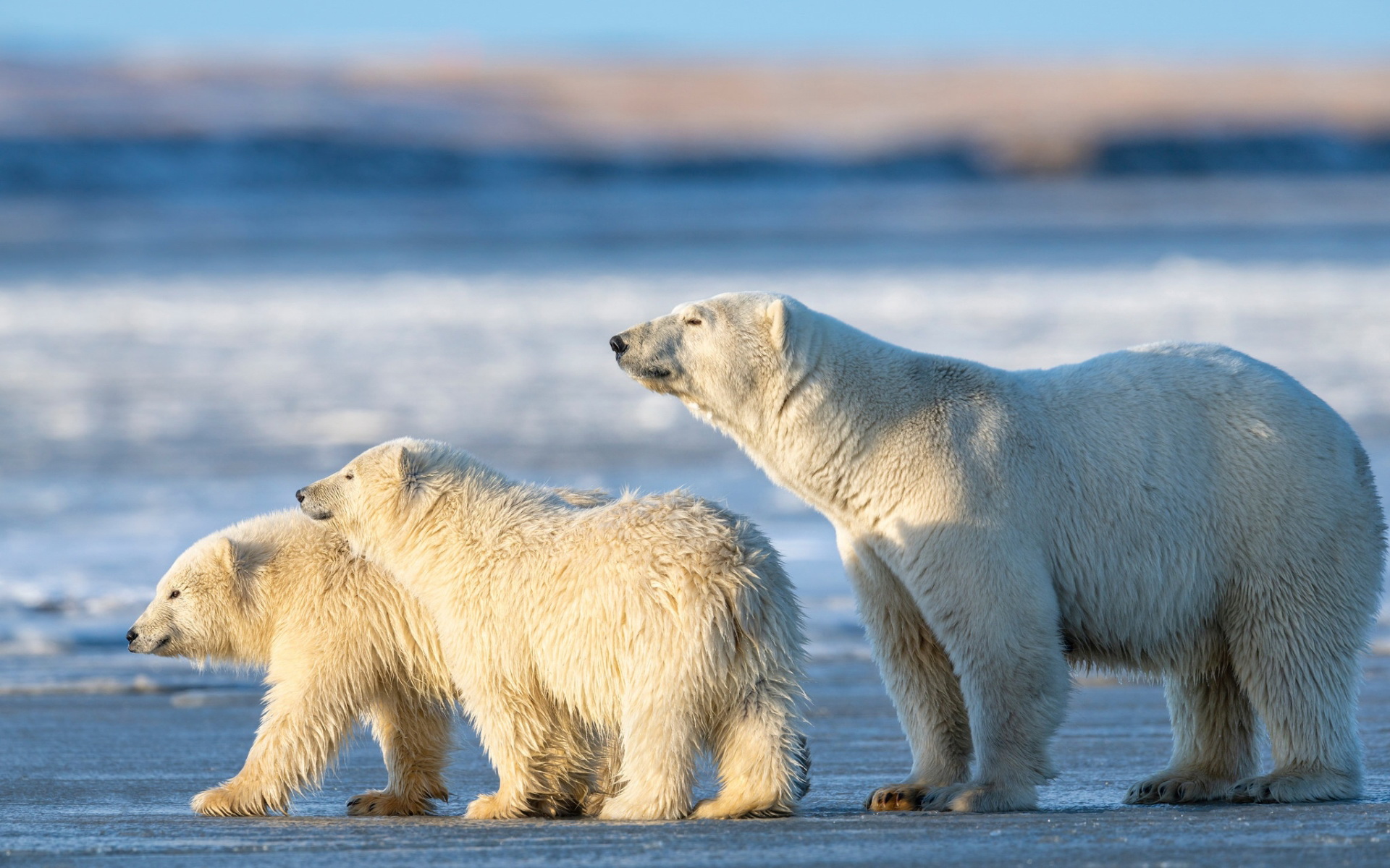 Description: A polar bear and her cub stand on the ice in the water of the ocean.