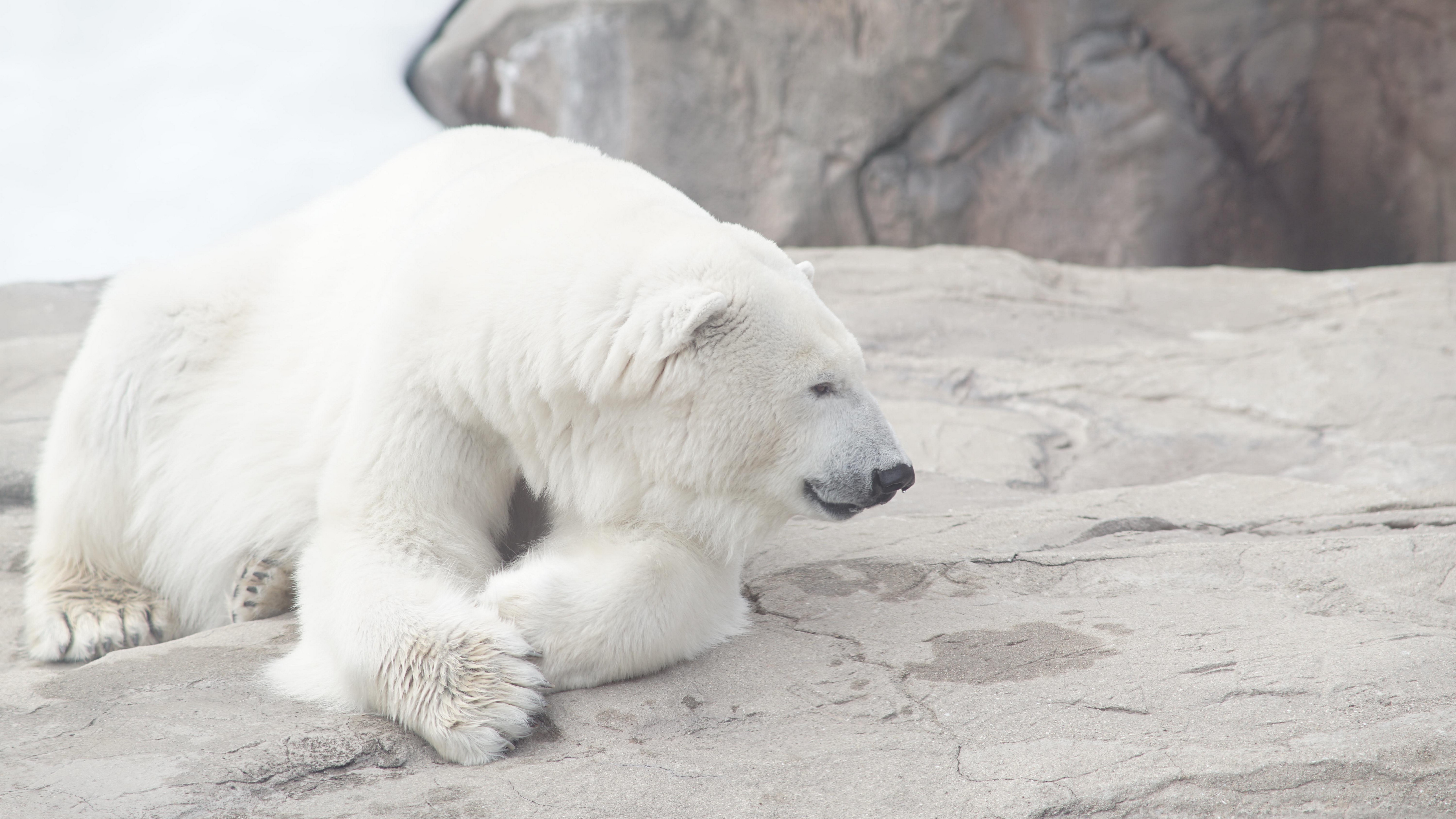 Description: A polar bear laying on a rock in a zoo enclosure at the zoo.
