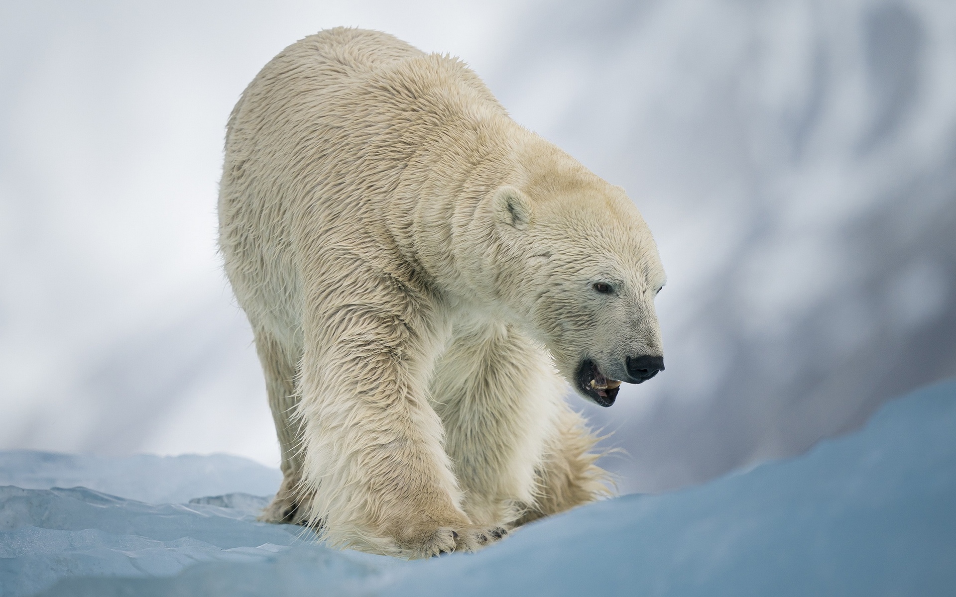 Description: A polar bear walking across a snow covered field with a sky background and clouds in the background.