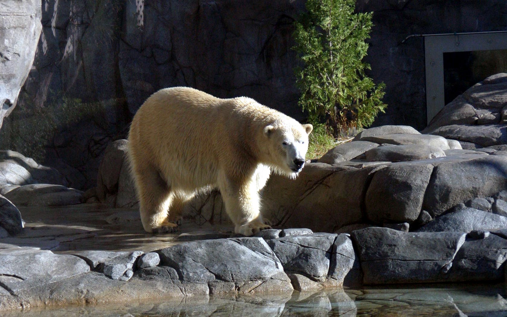 Description: A polar bear walking on rocks near water and rocks in a zoo enclosure with a small window in the background.