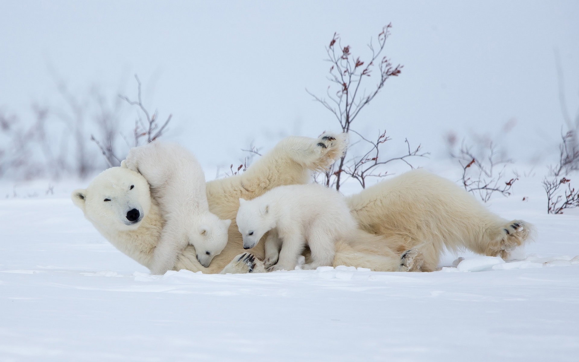 Description: A group of polar bears playing in the snow together with their cubs in the snow.