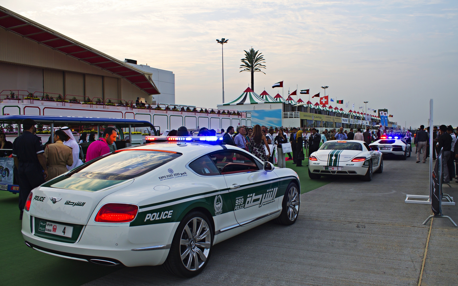 Description: A police car parked in front of a crowd of people on a street next to a carnival ride area.