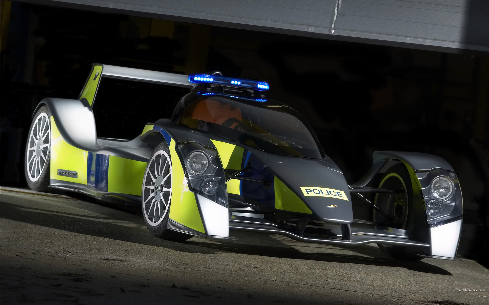 Description: A police car is parked in a garage with its lights on and a police car is parked in the garage.