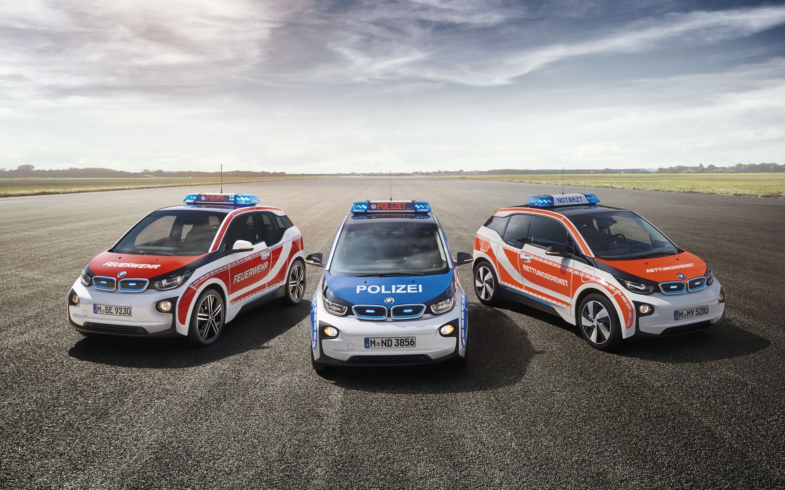 Description: Three police cars parked on a runway with a sky background and clouds in the background.