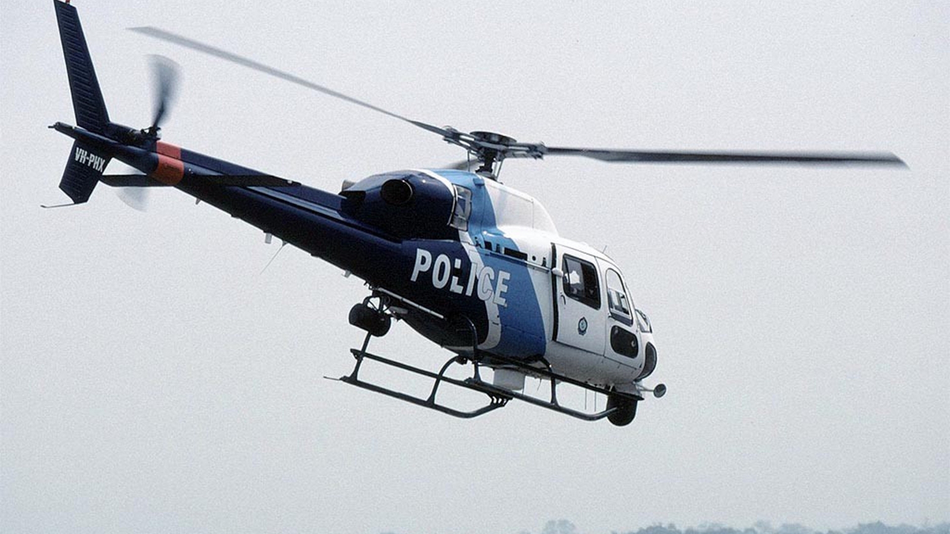 Description: A police helicopter flying through the air with its landing gear down and a person standing on the ground below.