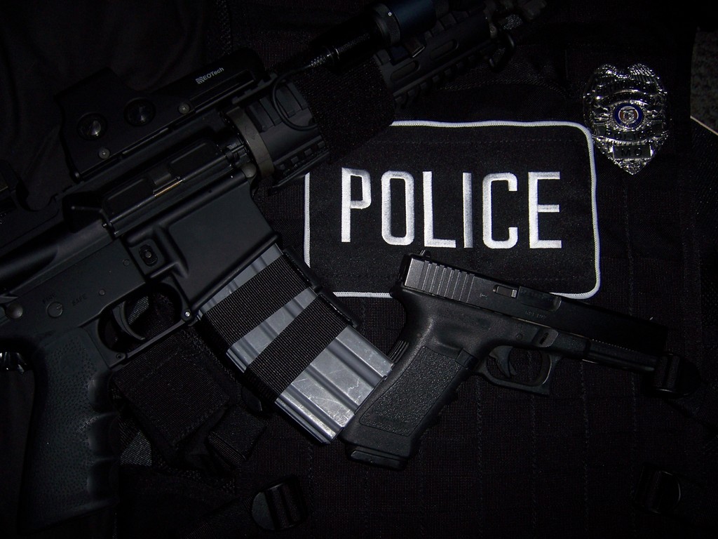 Description: A police vest with a gun and a badge on it that says police next to a police badge and a police badge.