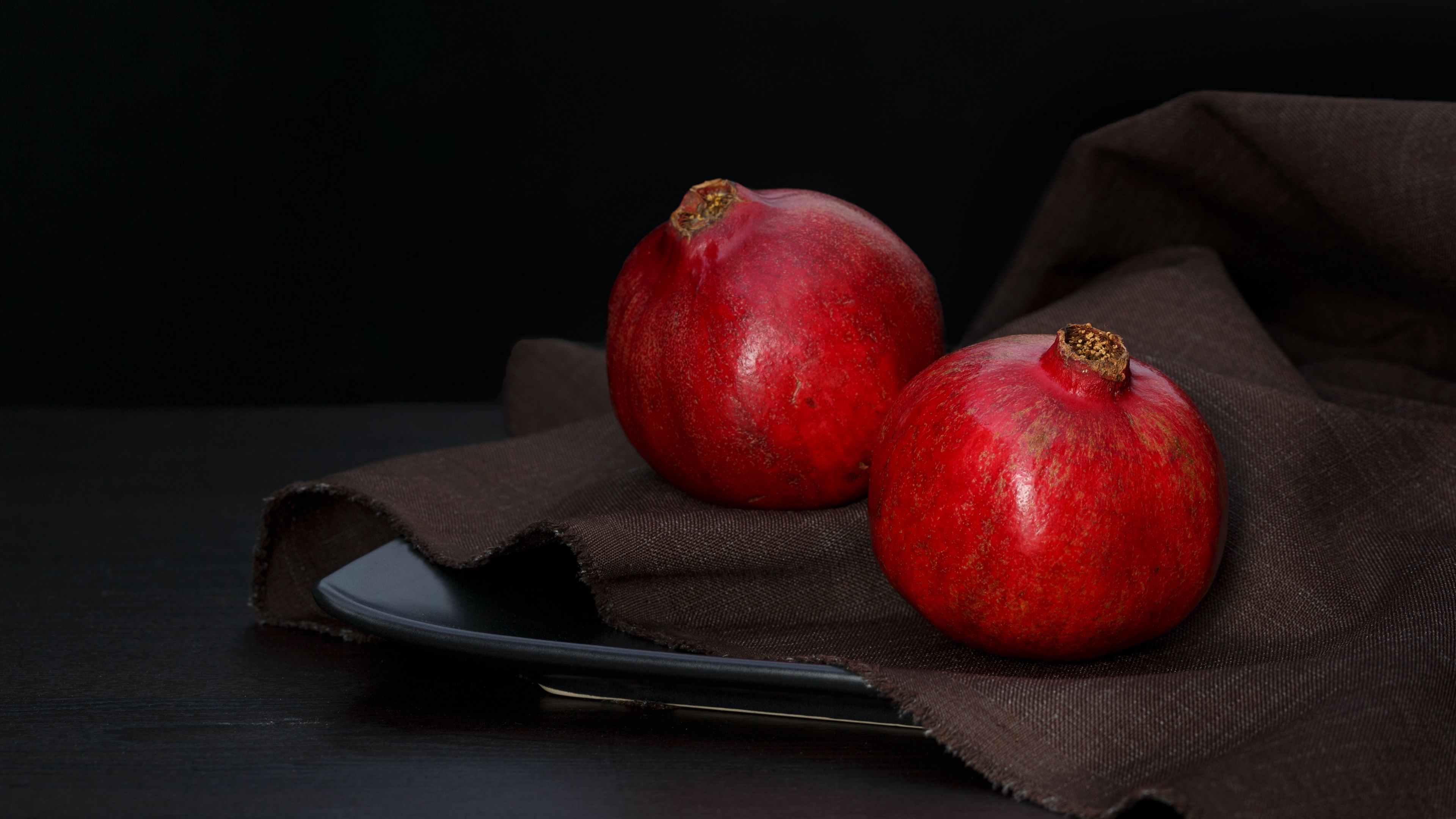 Description: Two pomegranates on a cloth with a spoon on a tablecloth with a cloth on it.