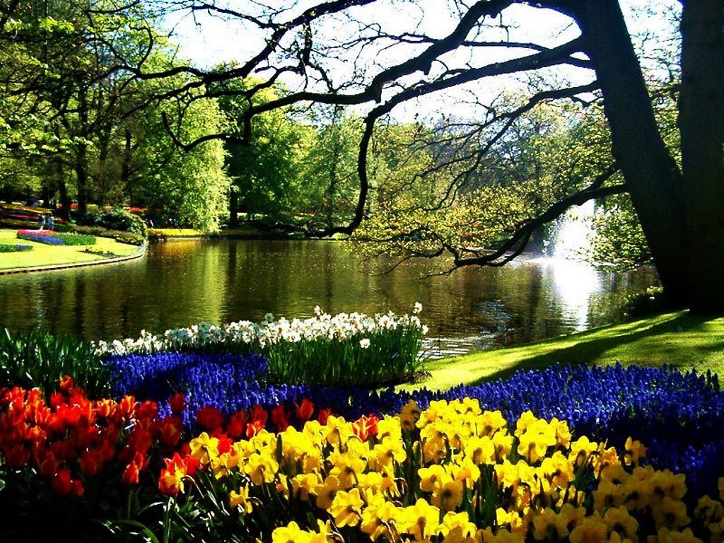 Description: A pond with a bunch of flowers in it and a tree in the background with a few flowers in the foreground.