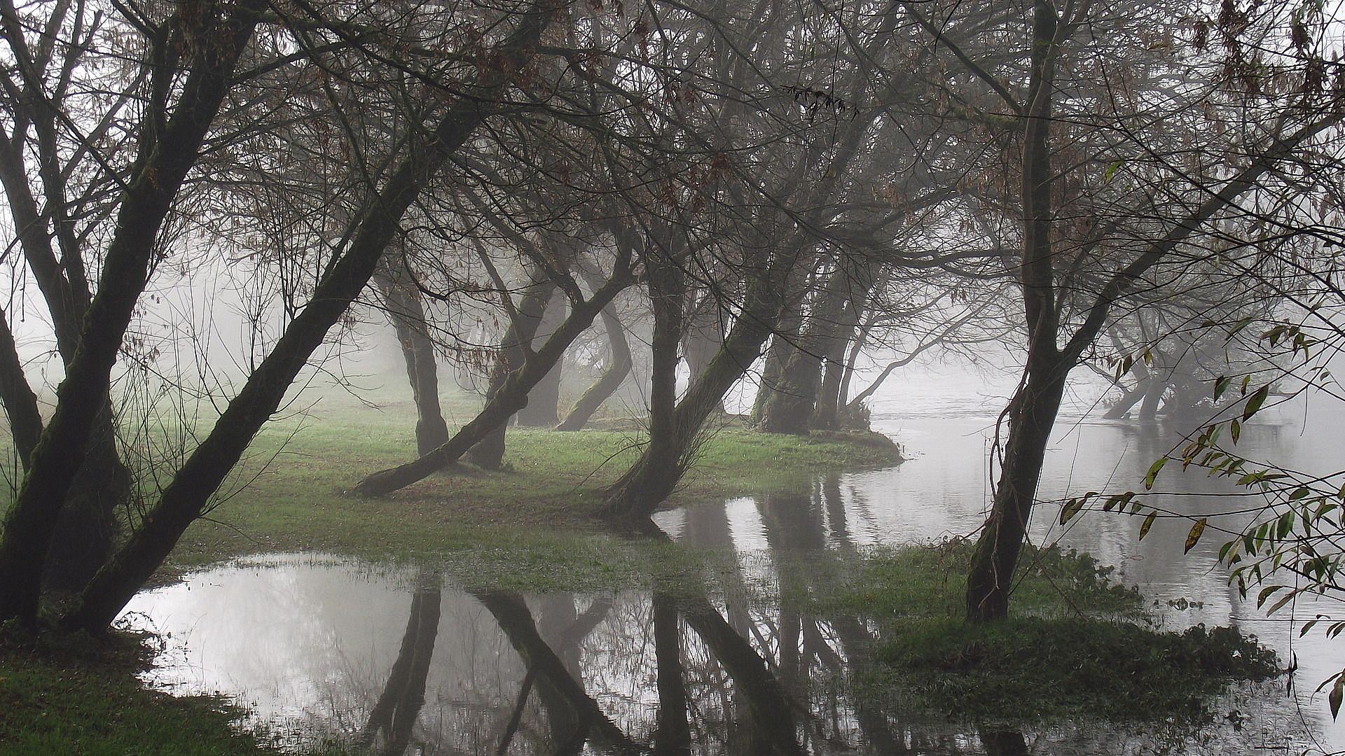 Description: A pond surrounded by trees and grass in the foggy day time with a bench in the foreground.