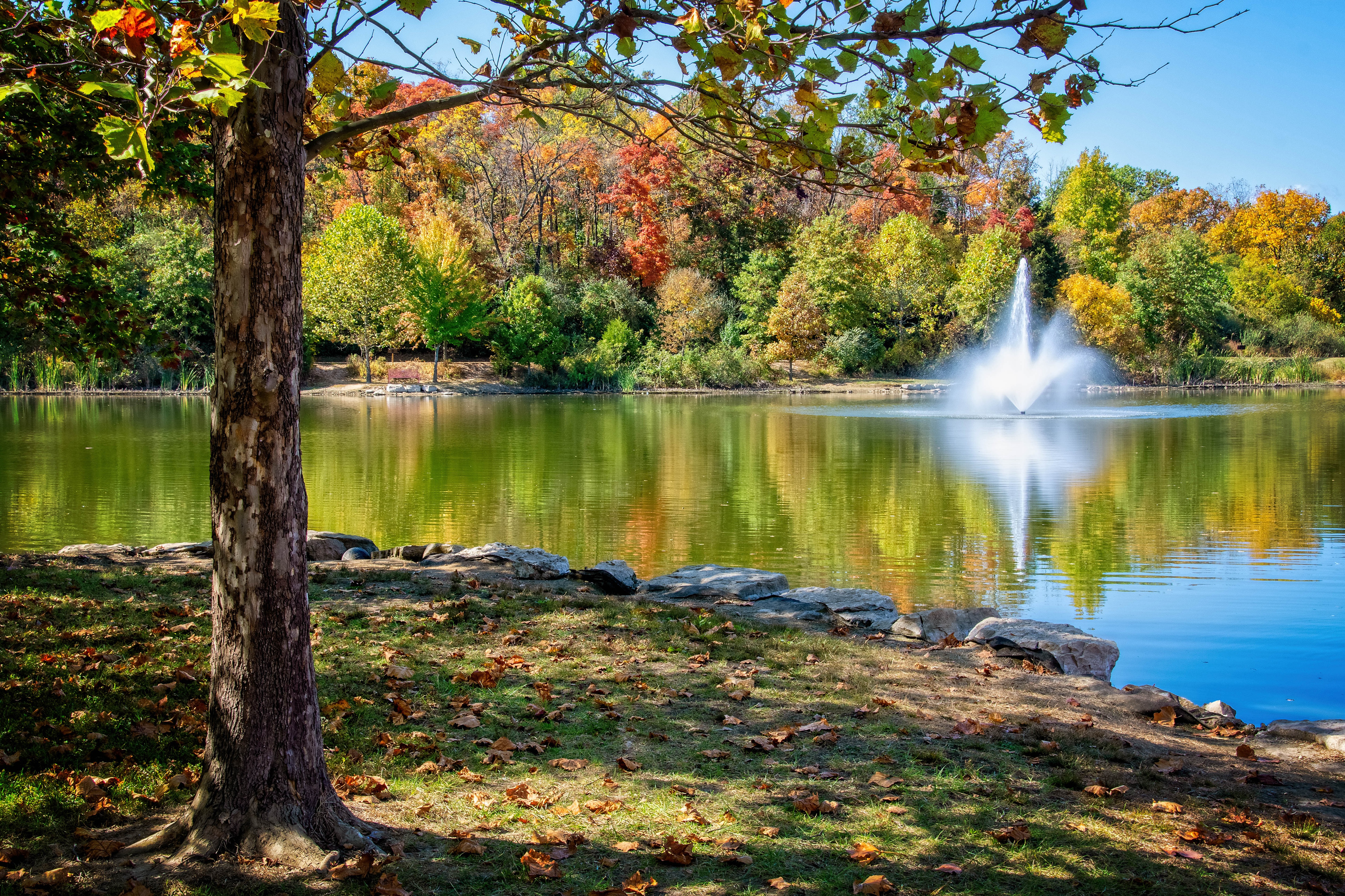 Description: A pond with a fountain in the middle of it surrounded by trees and leaves in the fall colors of the trees.