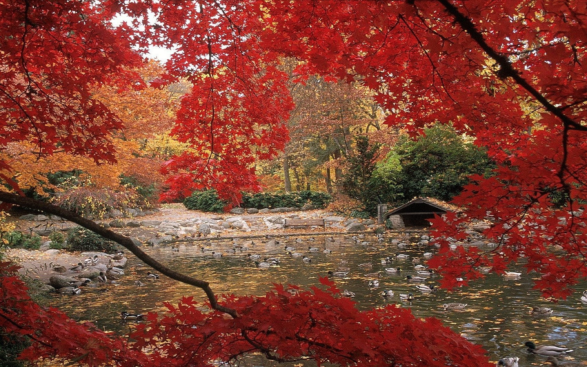 Description: A pond with rocks and trees with red leaves on it and a bridge in the background with a small building in the distance.