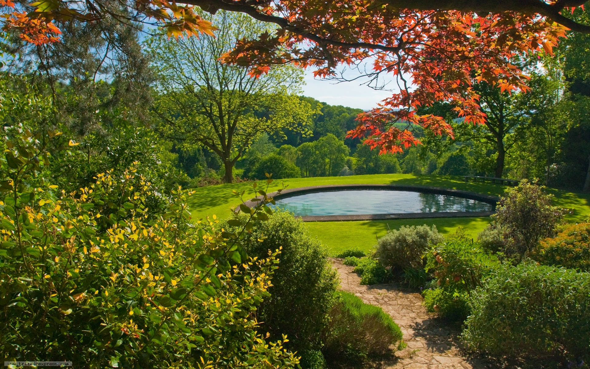 Description: A pond surrounded by trees and bushes in a park area with a path leading to it and a path leading to it.