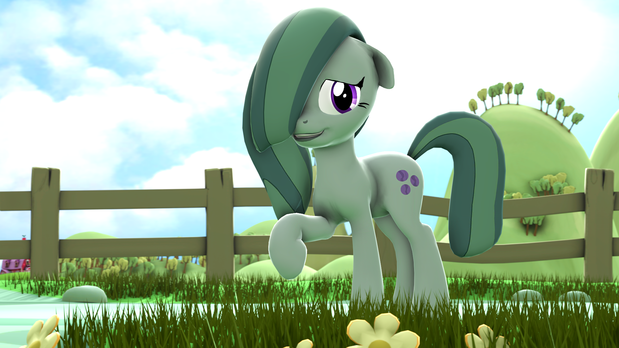 Description: A pony is standing in the grass near a fence and flowers in the background.