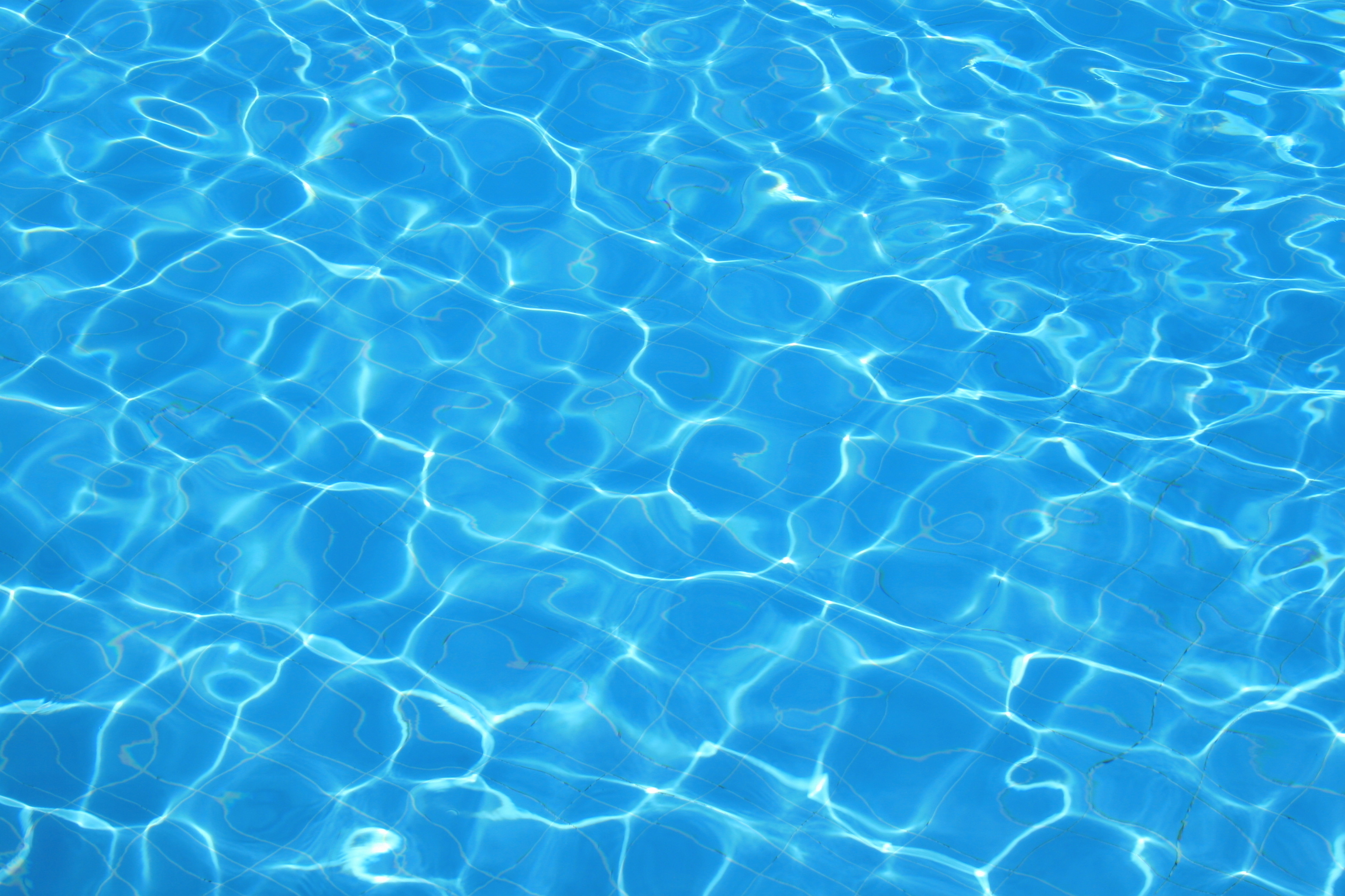 Description: A pool with blue water and a white umbrella in it's center of the pool is a blue sky.