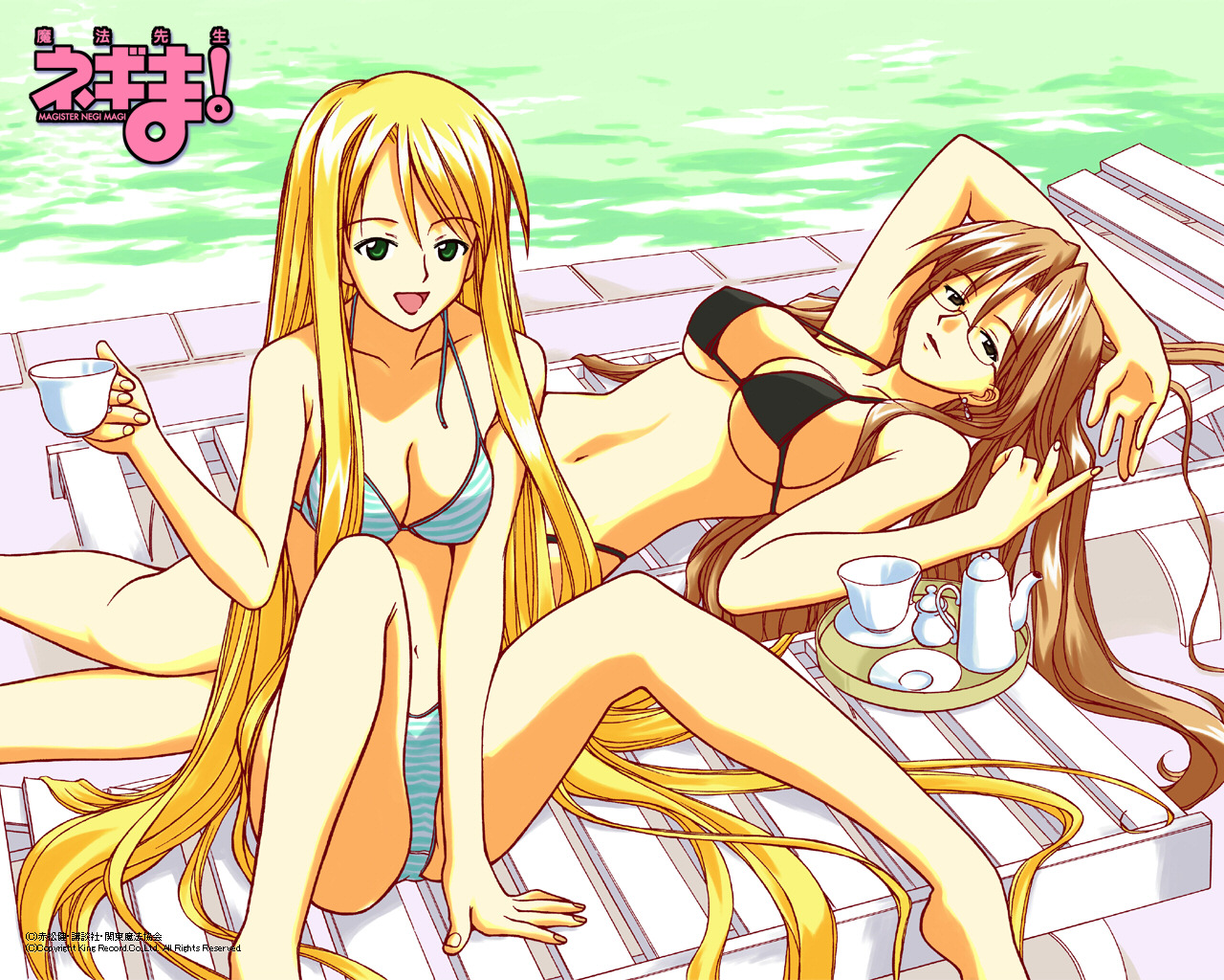 Description: Two women in bikinis laying on a pool side by side with a drink in hand and a cup in the other hand.