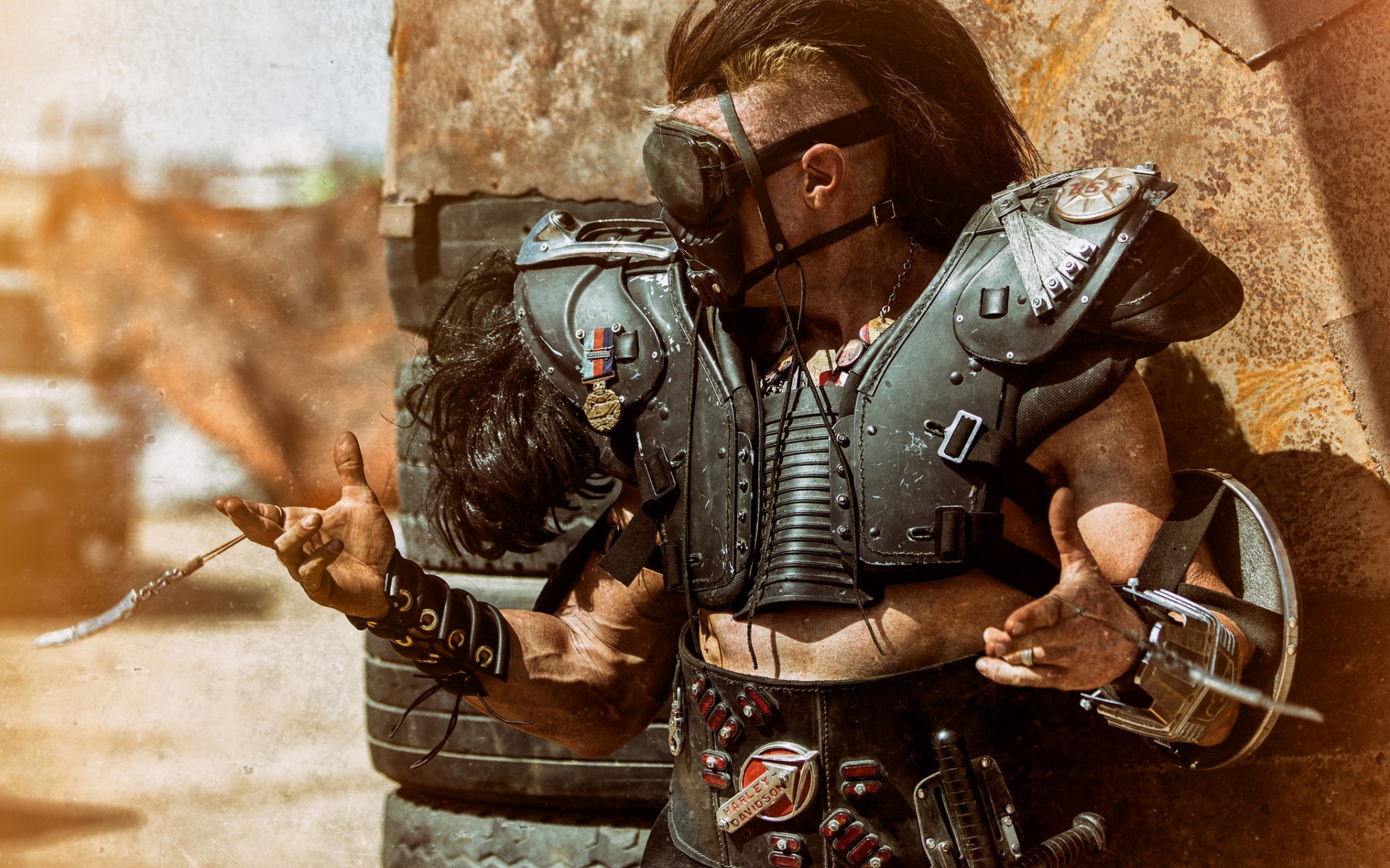 Description: A man in a leather outfit holding a sword and a helmet on his head and a metal chain around his neck.