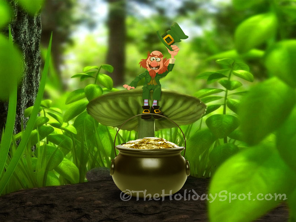 Description: A pot of gold with a leprezi character on it in the woods with a leprezi.