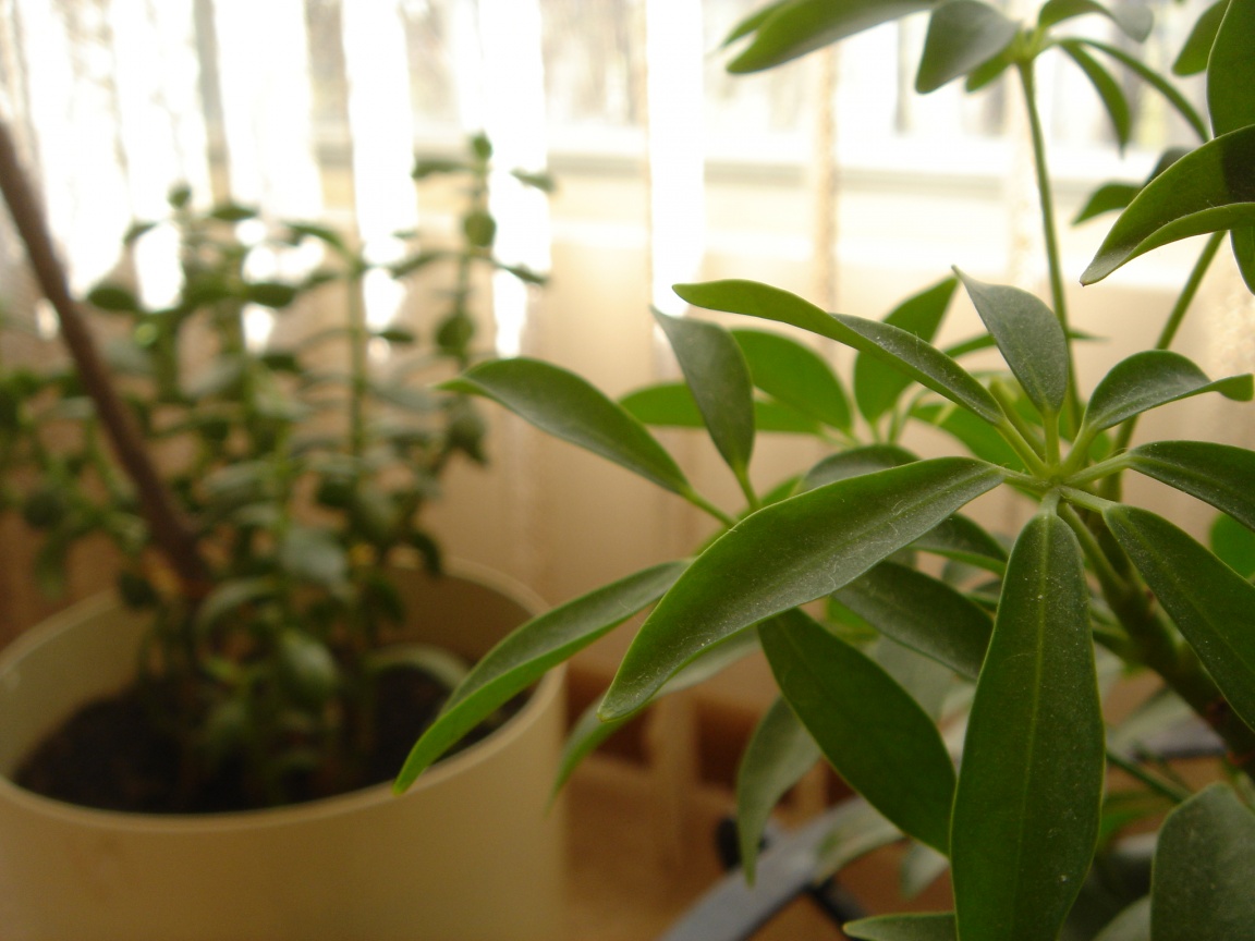 Description: A potted plant with green leaves on a table in front of a window with blinds on it and a wooden table with a knife.