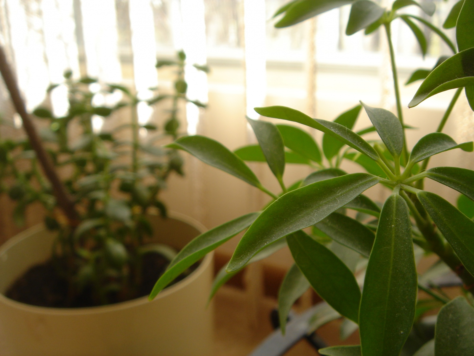 Description: A potted plant with green leaves on a table in front of a window with blinds and a window sill.
