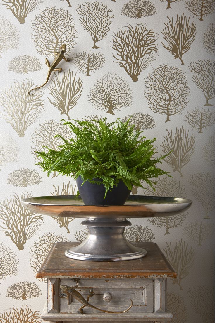 Description: A potted plant on a metal tray on a table in front of a wallpapered wall with a bird.