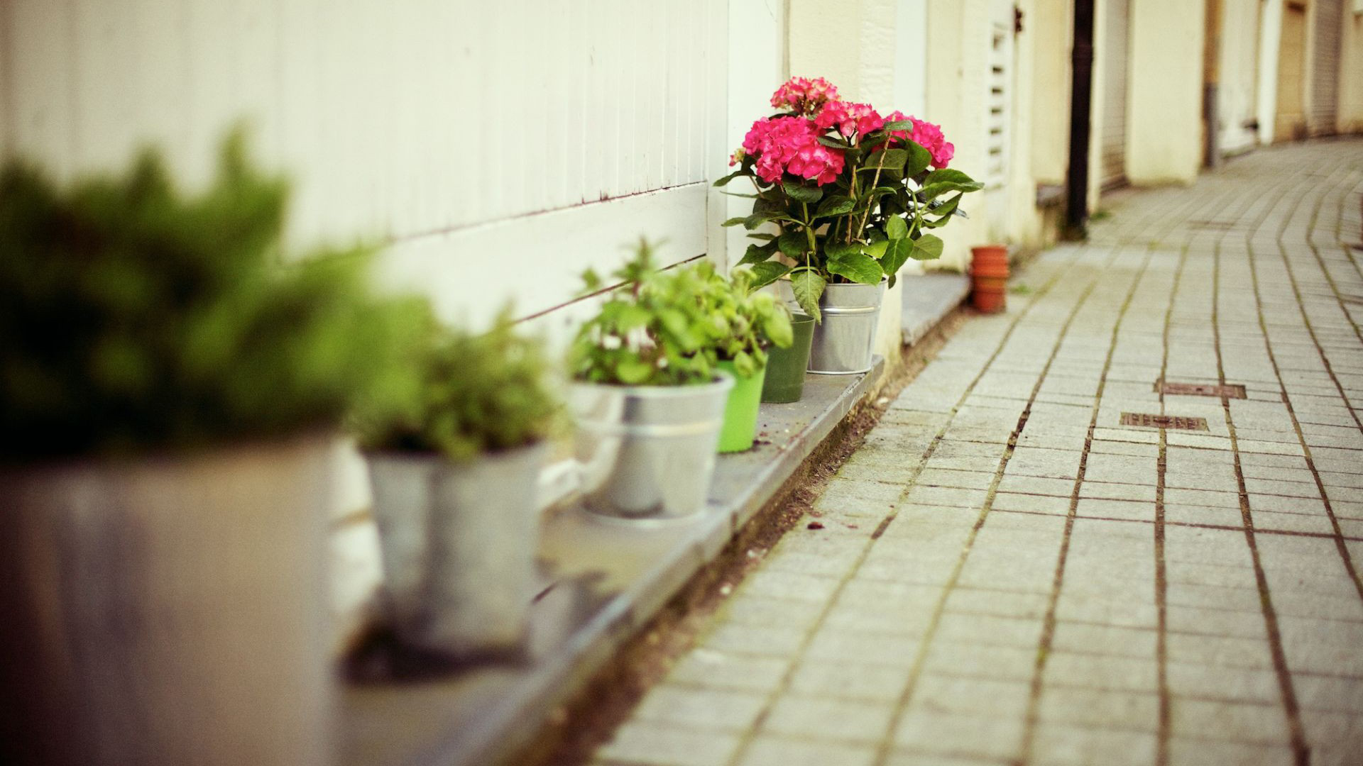 Description: A row of potted plants sitting on a ledge next to a building on a sidewalk with a brick walkway.