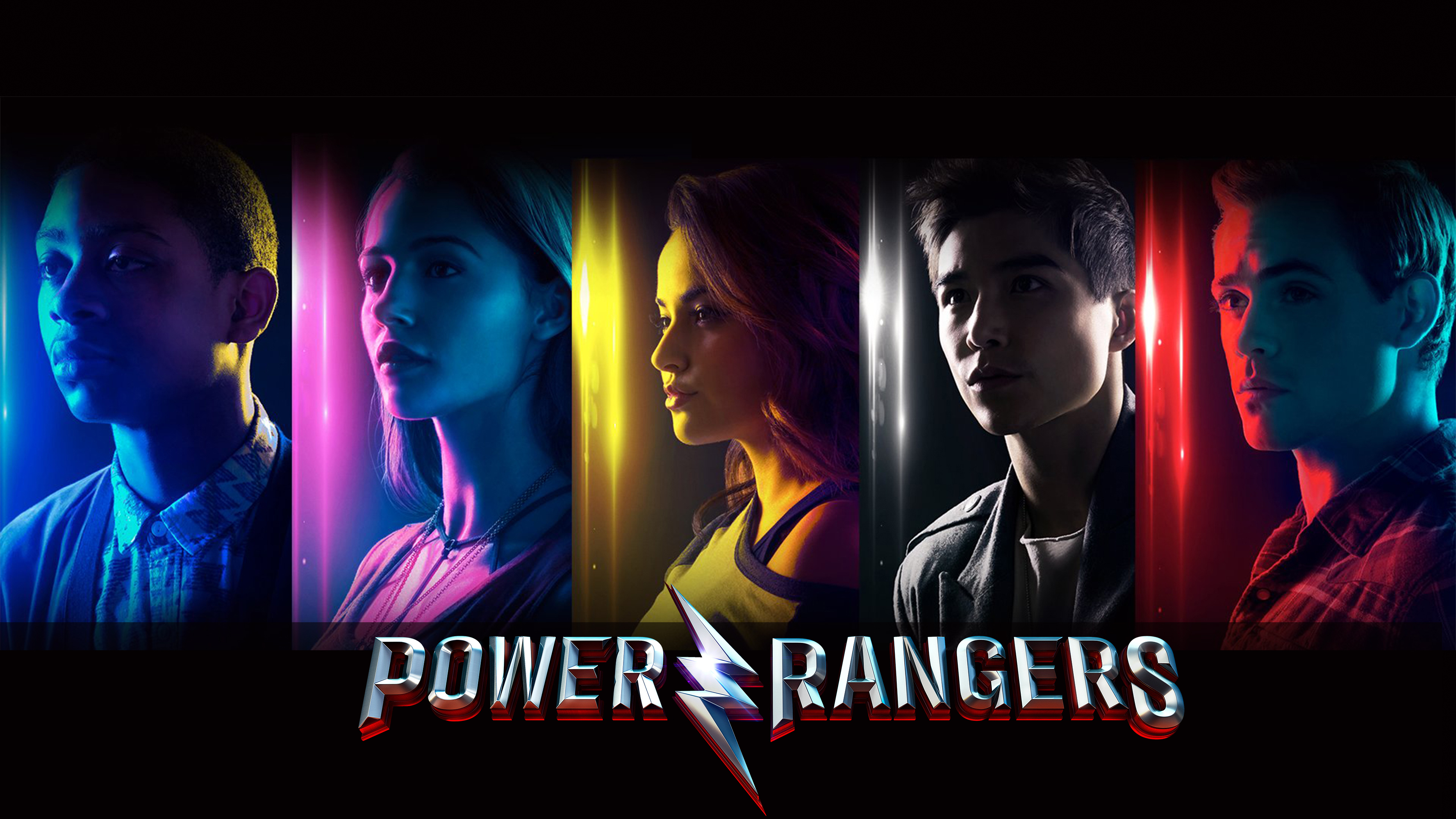 Description: A group of people standing in front of a wall with the words power rangers on it and a lightning.