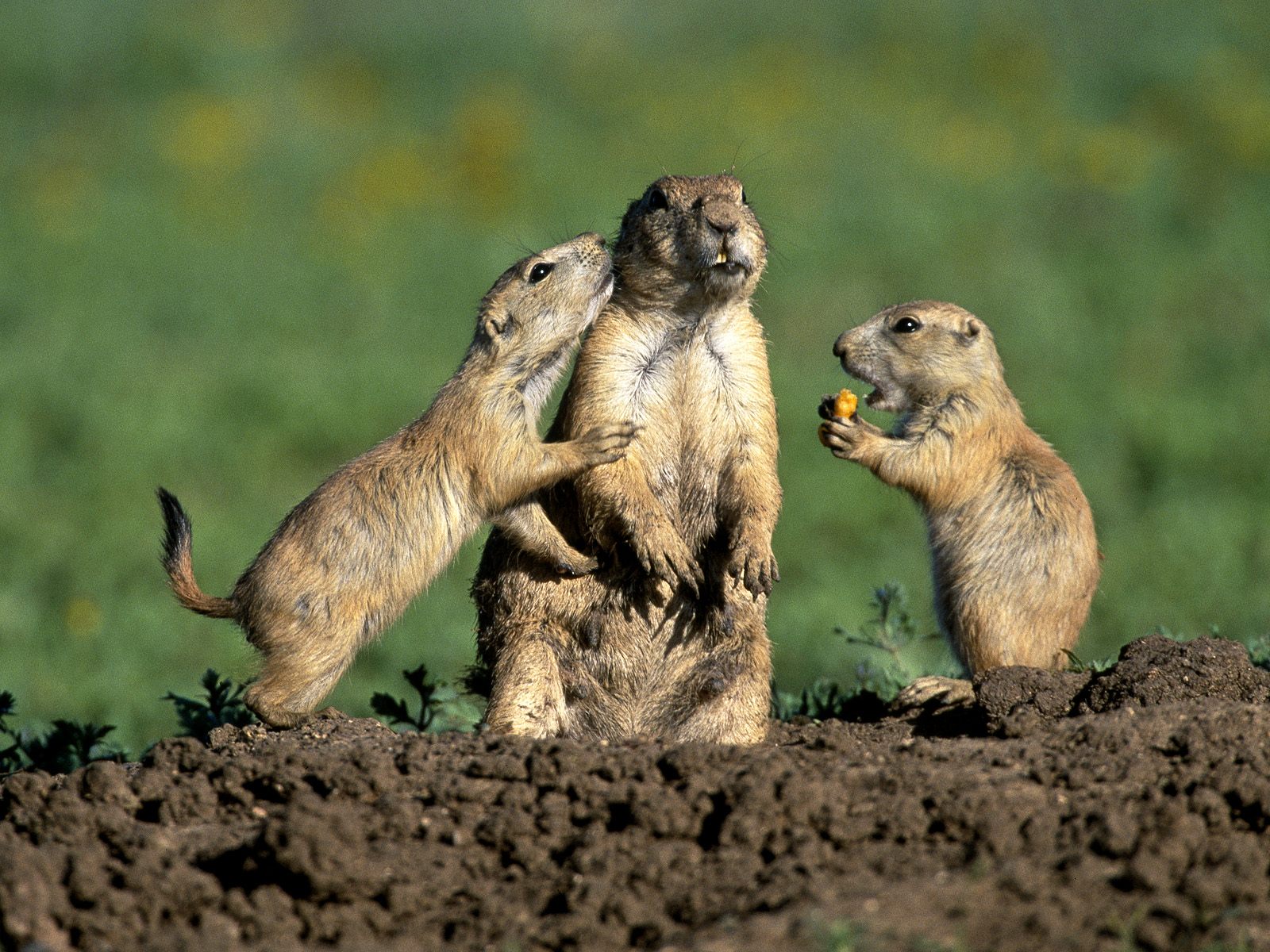 Description: Three prairie groundhogs standing on their hind legs eating something in the dirt and grass behind them is a field of green grass.