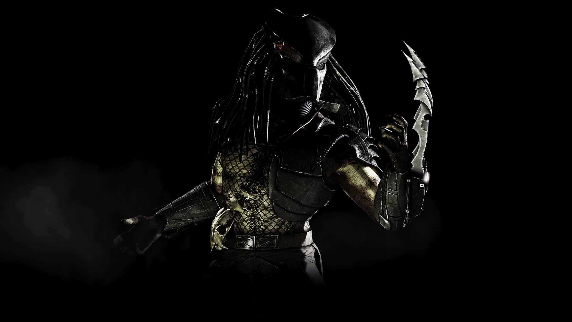 Description: A predator in a dark background holding a knife and a glove with his hands out to the side of his face.