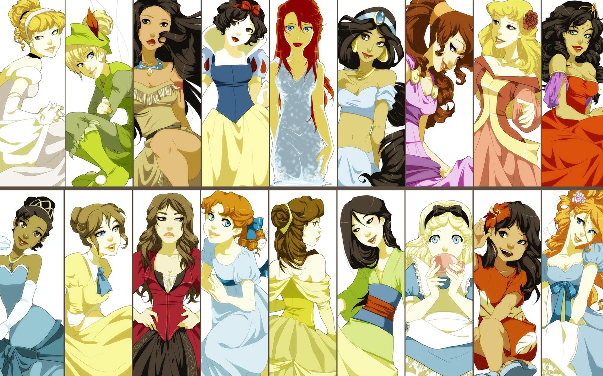 Description: A series of cartoon images of princesses in different outfits and colors.