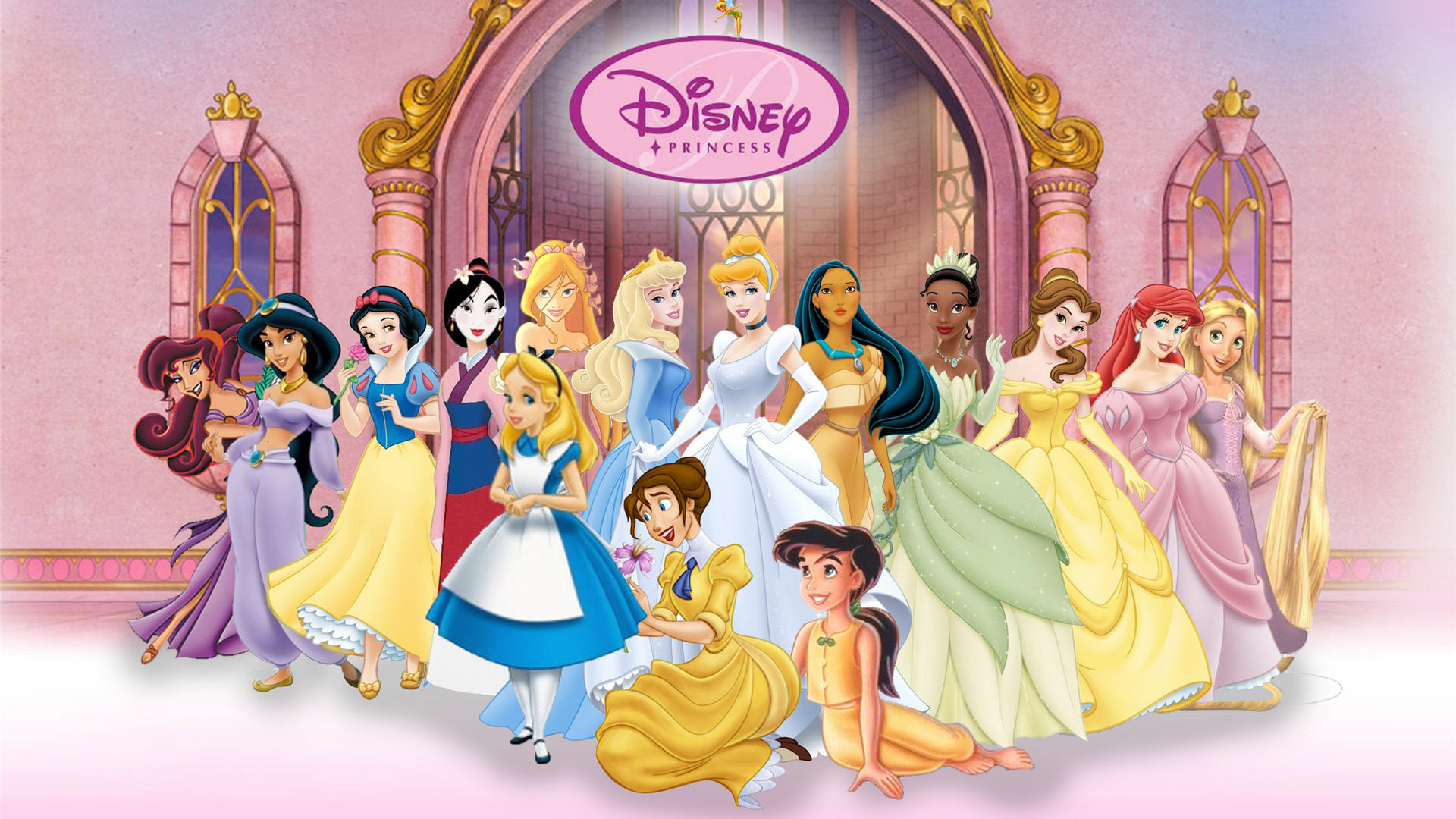 Description: A group of princesses standing in front of a pink castle with a pink door and a pink sign.