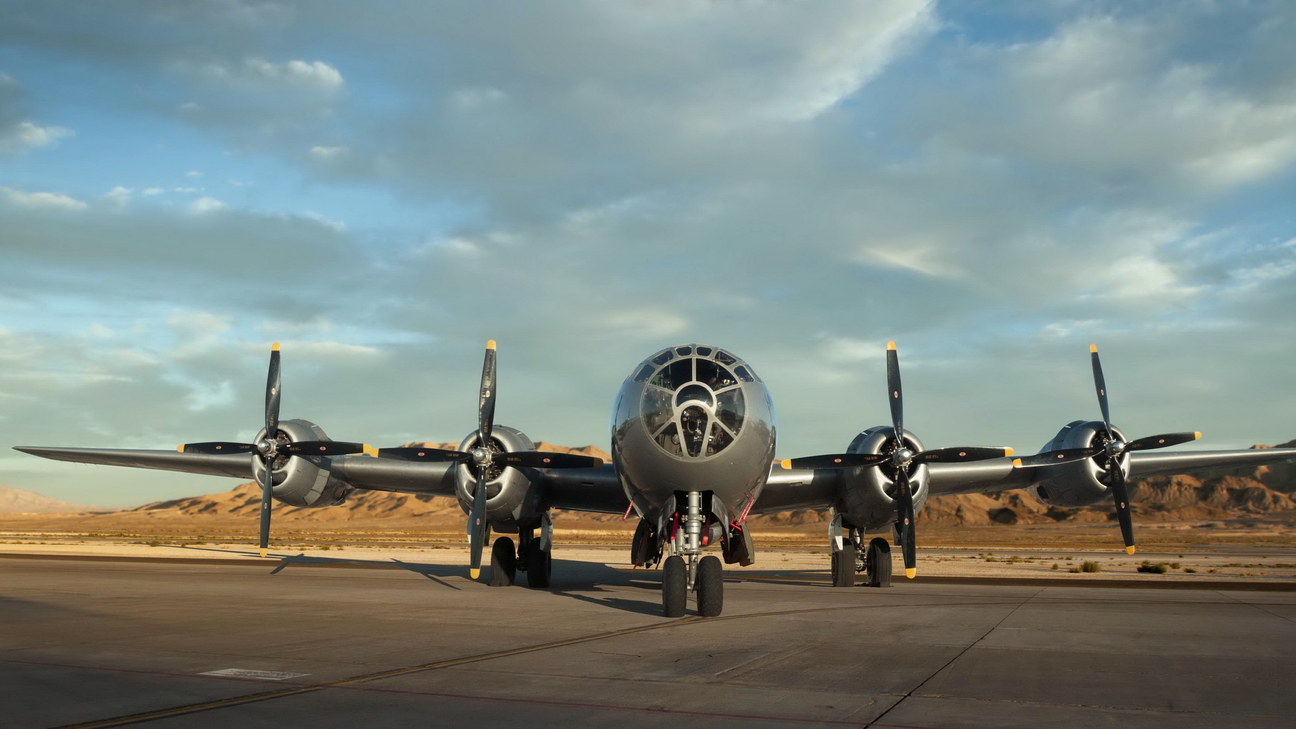 Description: A large propeller plane sitting on top of an airport runway with mountains in the background and clouds in the sky.