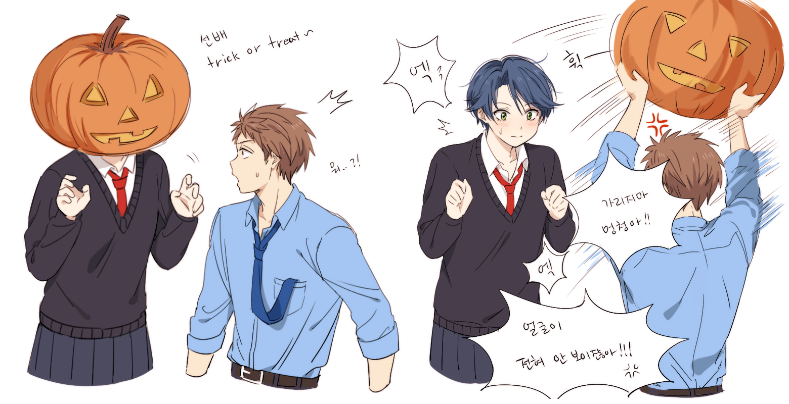 Description: A group of people with pumpkins on their heads and one holding a pumpkin in his hand and another holding a pumpkin in his other hand.