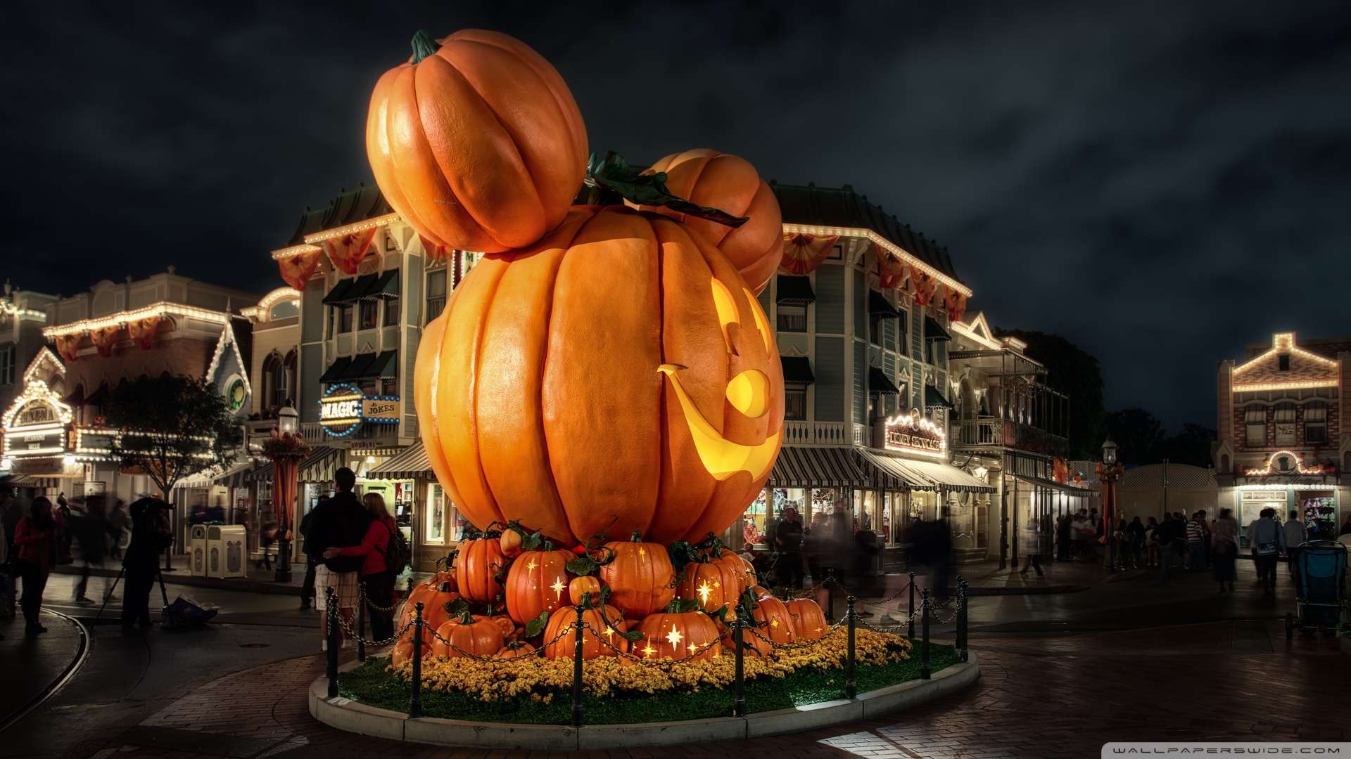Description: A large pumpkin statue in a city square at night with people walking around it and lights on the buildings.