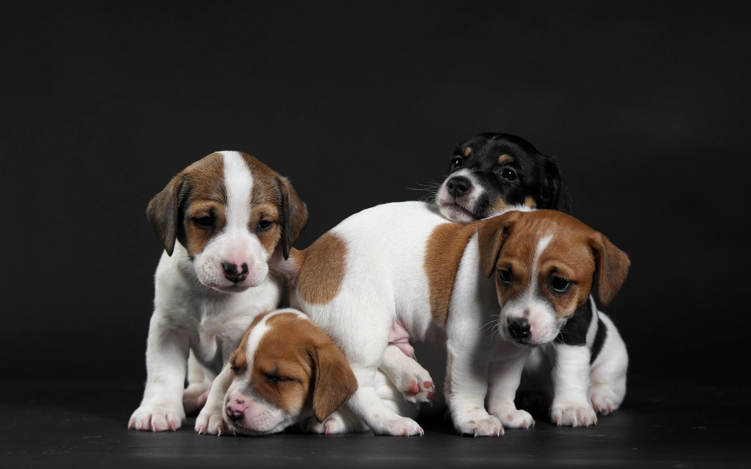 Description: A group of puppies sitting next to each other on a black background with a black background behind them.