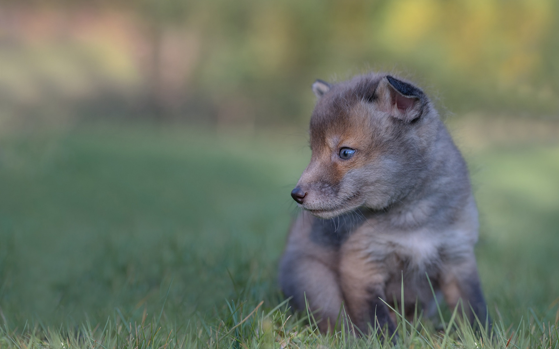 Description: A small puppy sitting in the grass looking at something in the distance with a blurry background of trees.
