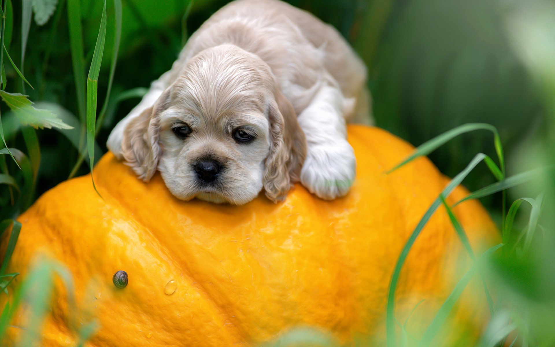 Description: A puppy is laying on top of a pumpkin in the grass.
